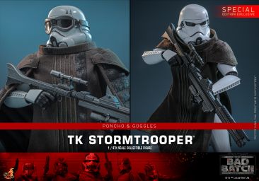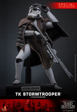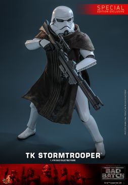Hot Toys is excited to present the 1/6th scale TK Stormtrooper™ Collectible Figure. The figure features a newly crafted TK Stormtrooper helmeted head with realistic weathering effects. The costume features a newly crafted set of white and weathered TK Stormtrooper armor, a fabric undersuit, a utility belt, and a pair of boots — all authentically recreated to capture the worn, early-era aesthetic seen in The Bad Batch.