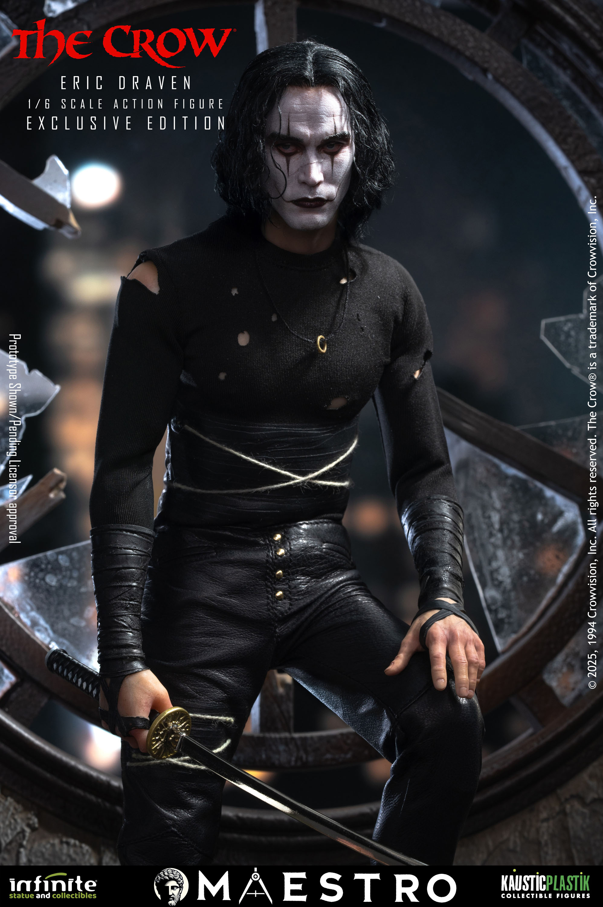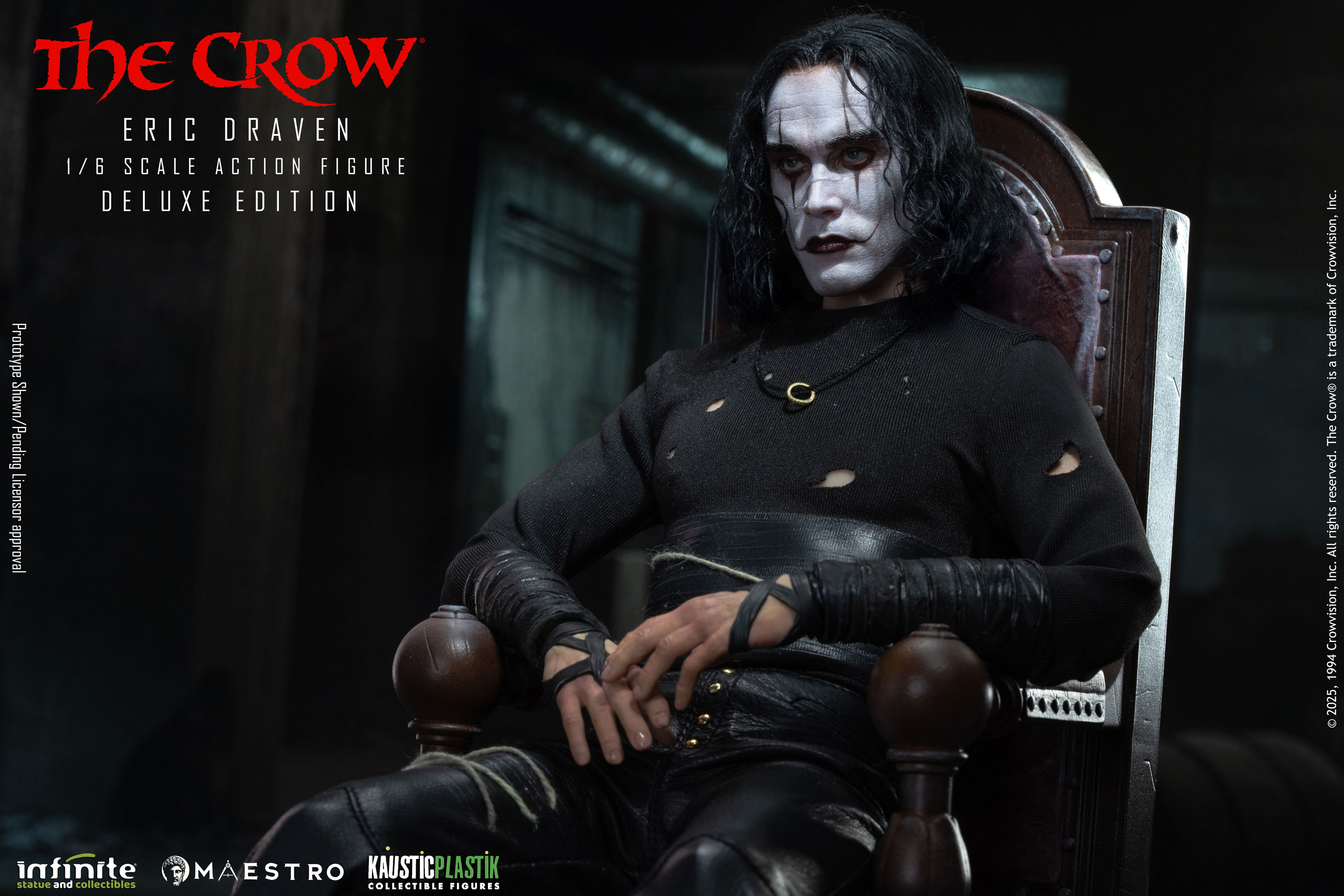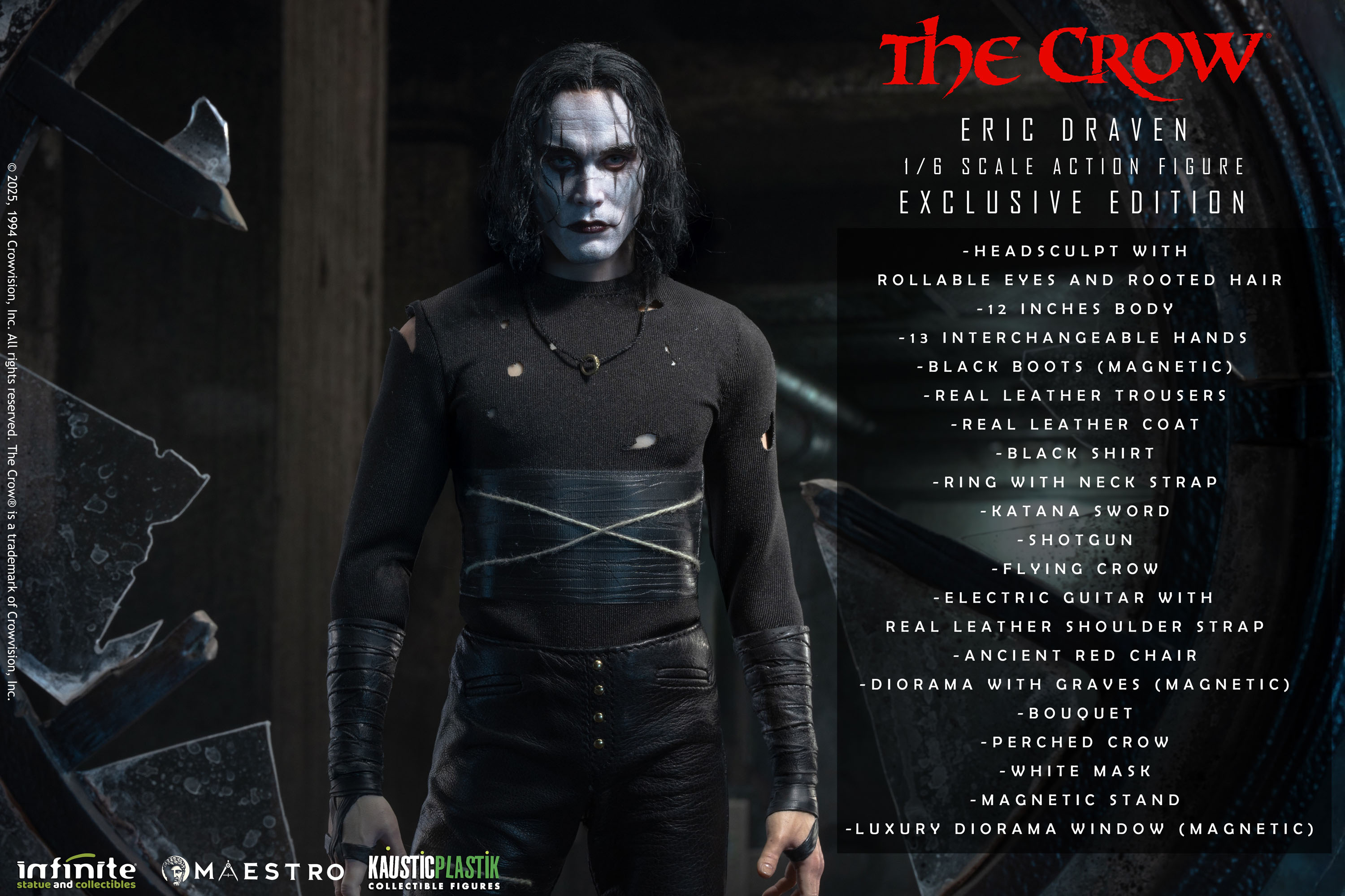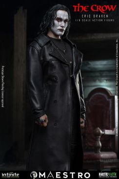 A new set of pre-orders have gone live for and Eric Draven 1/6 Scale Figure from The Crow (1994). The figure is a joint venture between Infinite Statue and Kaustic Plastik as part of the Maestro line. There are four editions available. The Standard Edition ($380) includes molded hair, multiple interchangeable hands, a coat, a crow, a chair, a guitar, a shotgun, and a sword. The Deluxe Edition ($480) swaps the sculpted hair for hand rooted hair. The Deluxe Gold Edition ($580) adds a graveyard diorama display and a white mask. Finally the Exclusive Edition ($650) adds a window with candles diorama.
