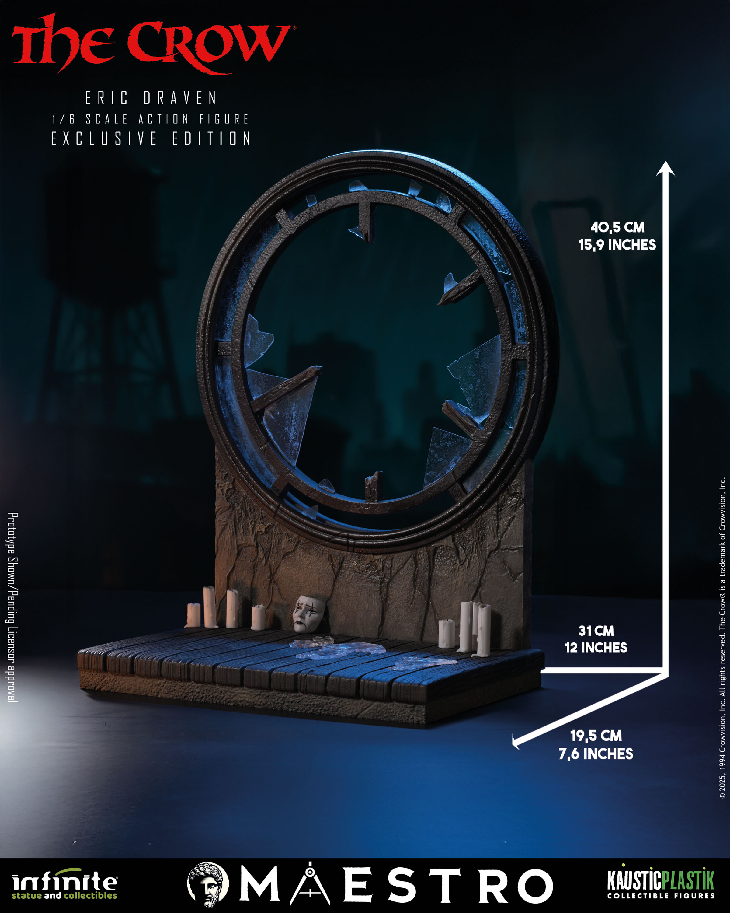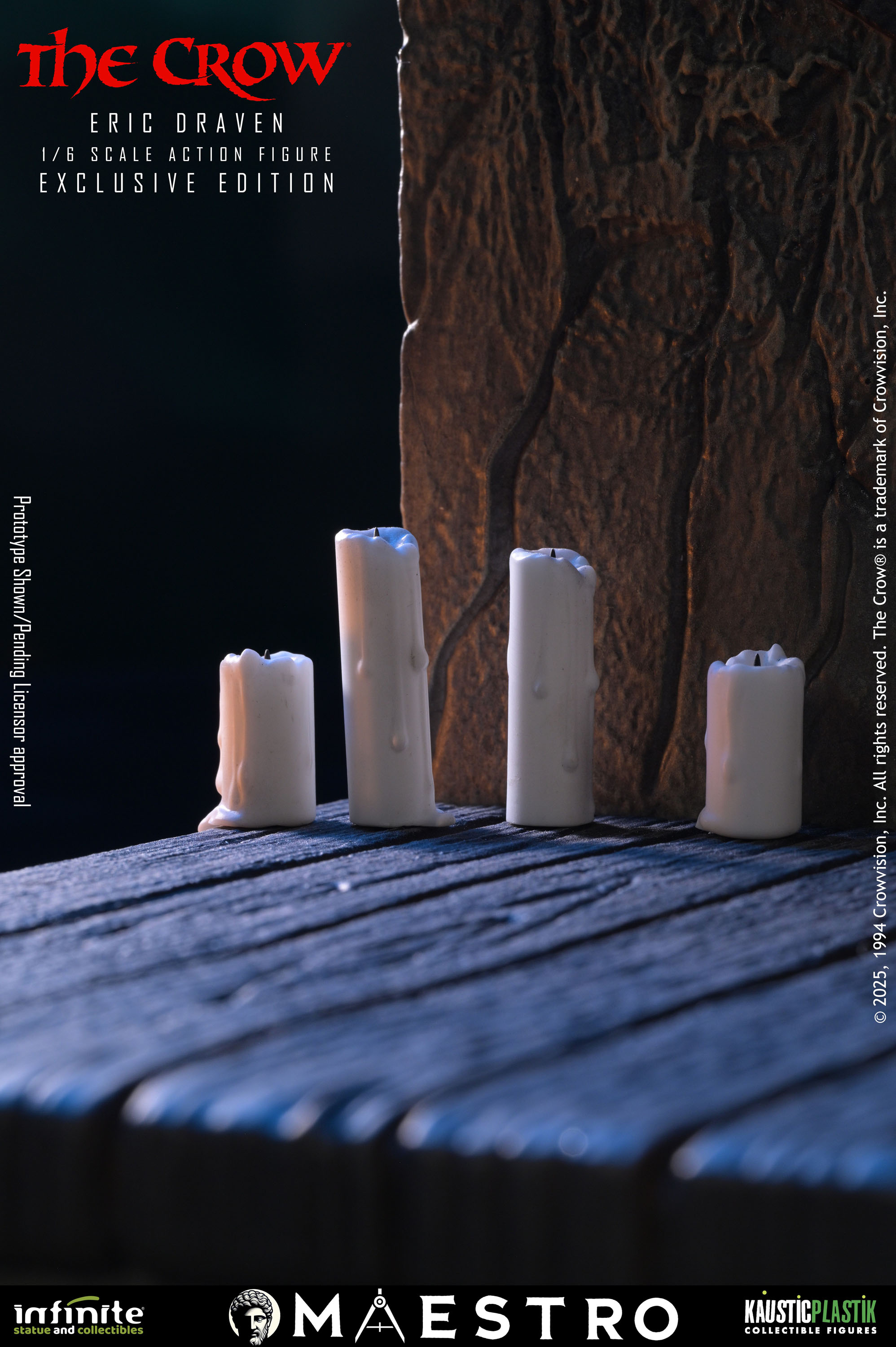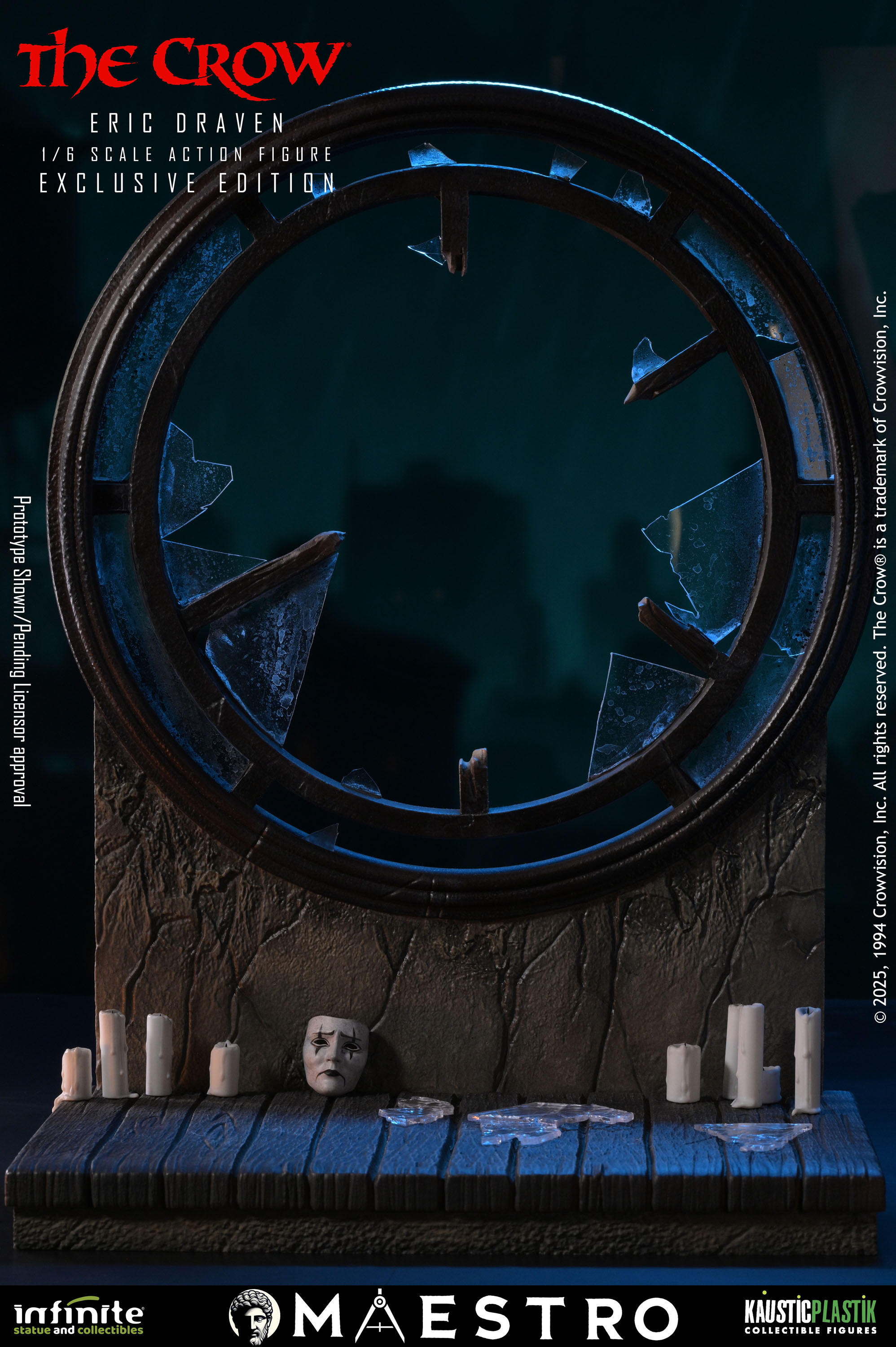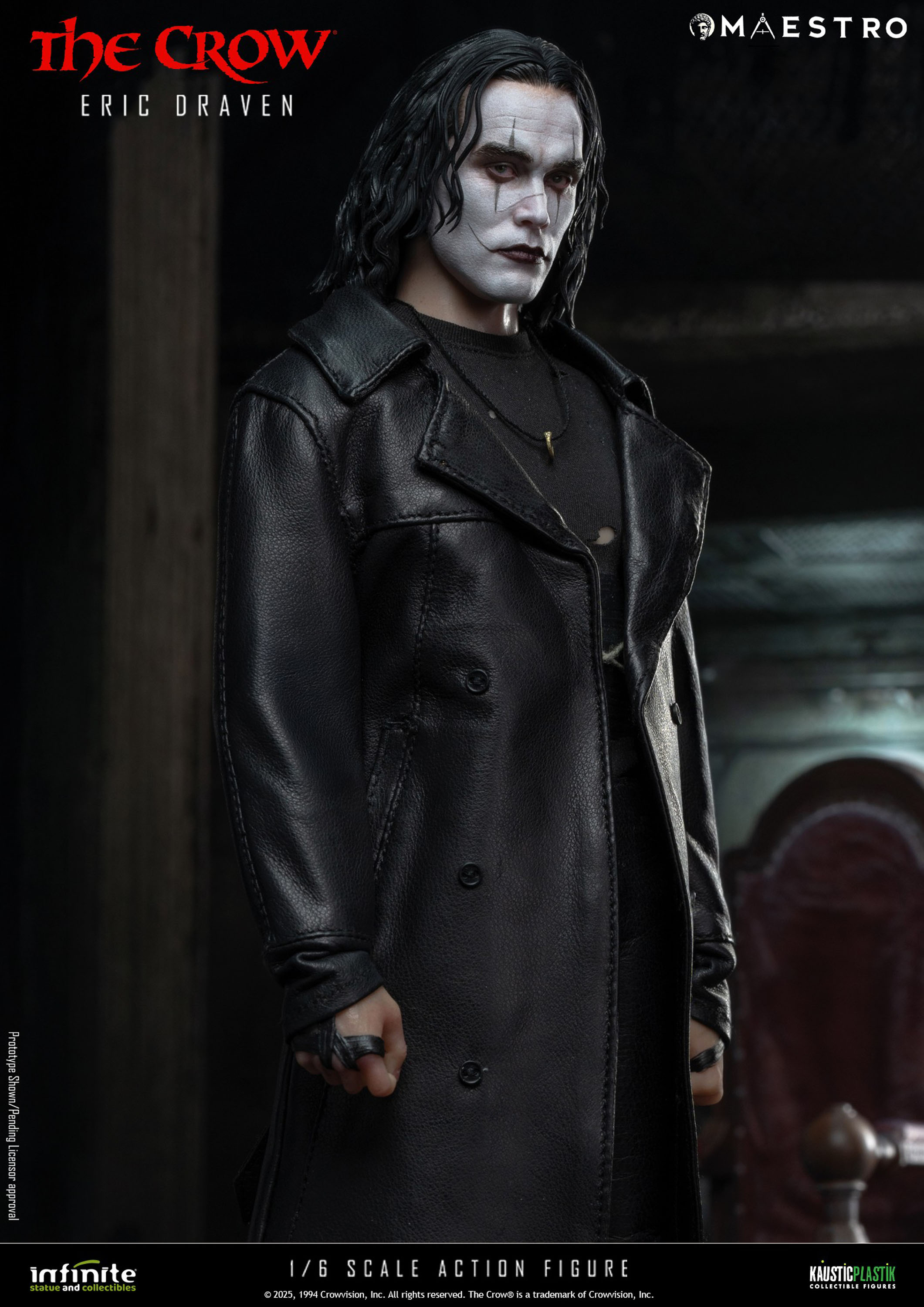 A new set of pre-orders have gone live for and Eric Draven 1/6 Scale Figure from The Crow (1994). The figure is a joint venture between Infinite Statue and Kaustic Plastik as part of the Maestro line. There are four editions available. The Standard Edition ($380) includes molded hair, multiple interchangeable hands, a coat, a crow, a chair, a guitar, a shotgun, and a sword. The Deluxe Edition ($480) swaps the sculpted hair for hand rooted hair. The Deluxe Gold Edition ($580) adds a graveyard diorama display and a white mask. Finally the Exclusive Edition ($650) adds a window with candles diorama.