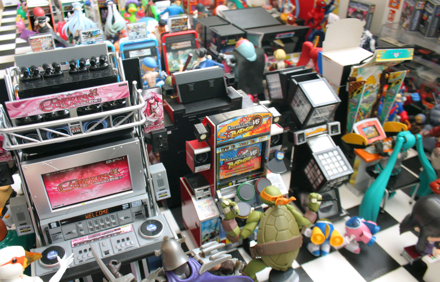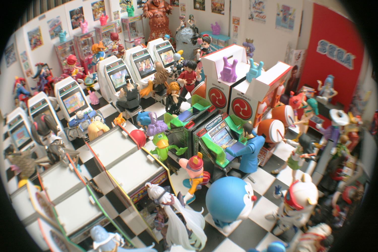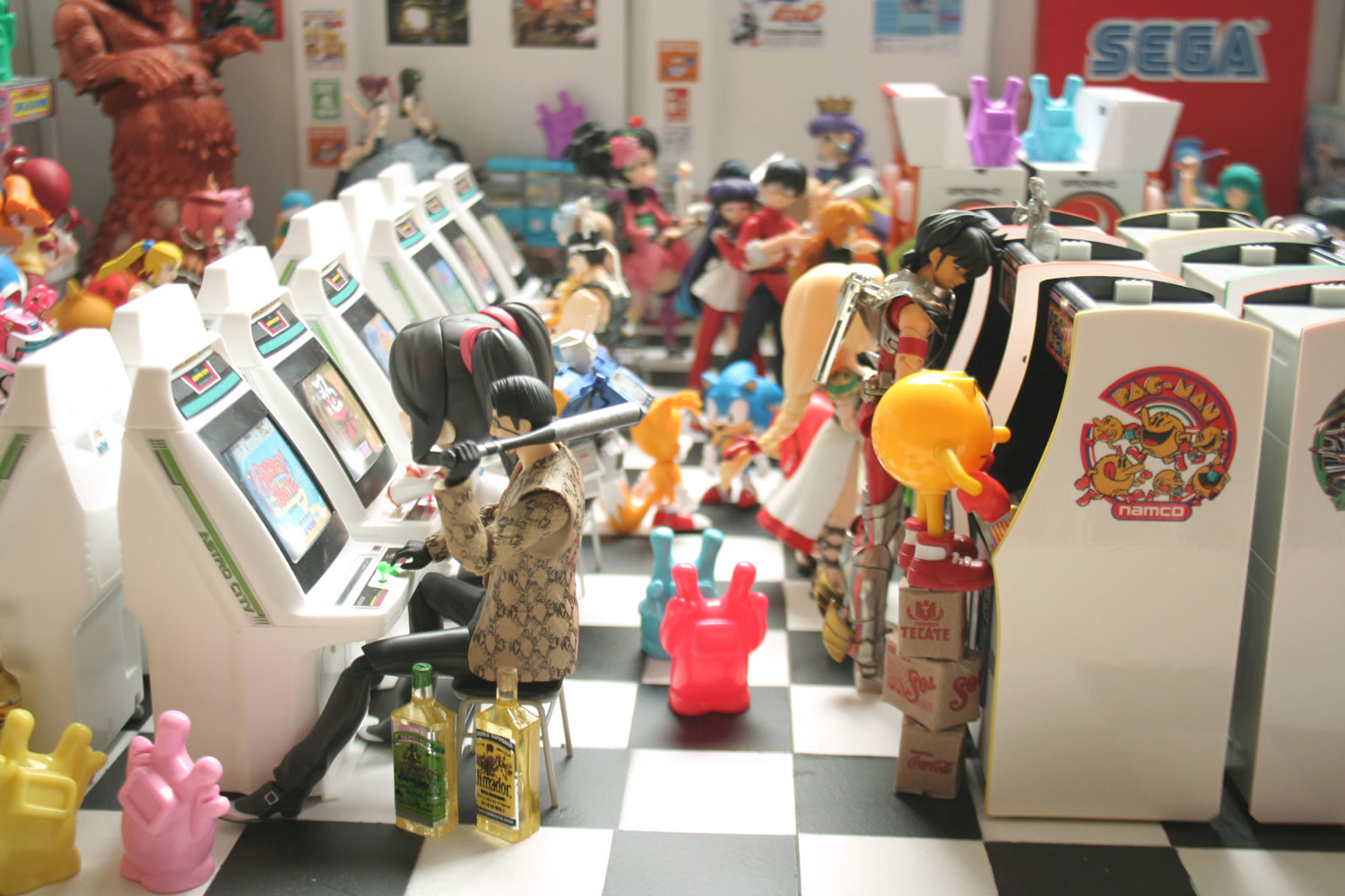 Wow, thats amazing, great pics. love arcade photos. i like the attention to detail like: barcardi bottles, boxes pacman is standing on and the console display with the genesis's, superb!...are you sure those arcades are for 1:12? seems smaller to me for some reason. the only thing i would change from those pics is the floor, its kinda busy and takes away from the figures, make the floor a simple color instead of the checkered floor