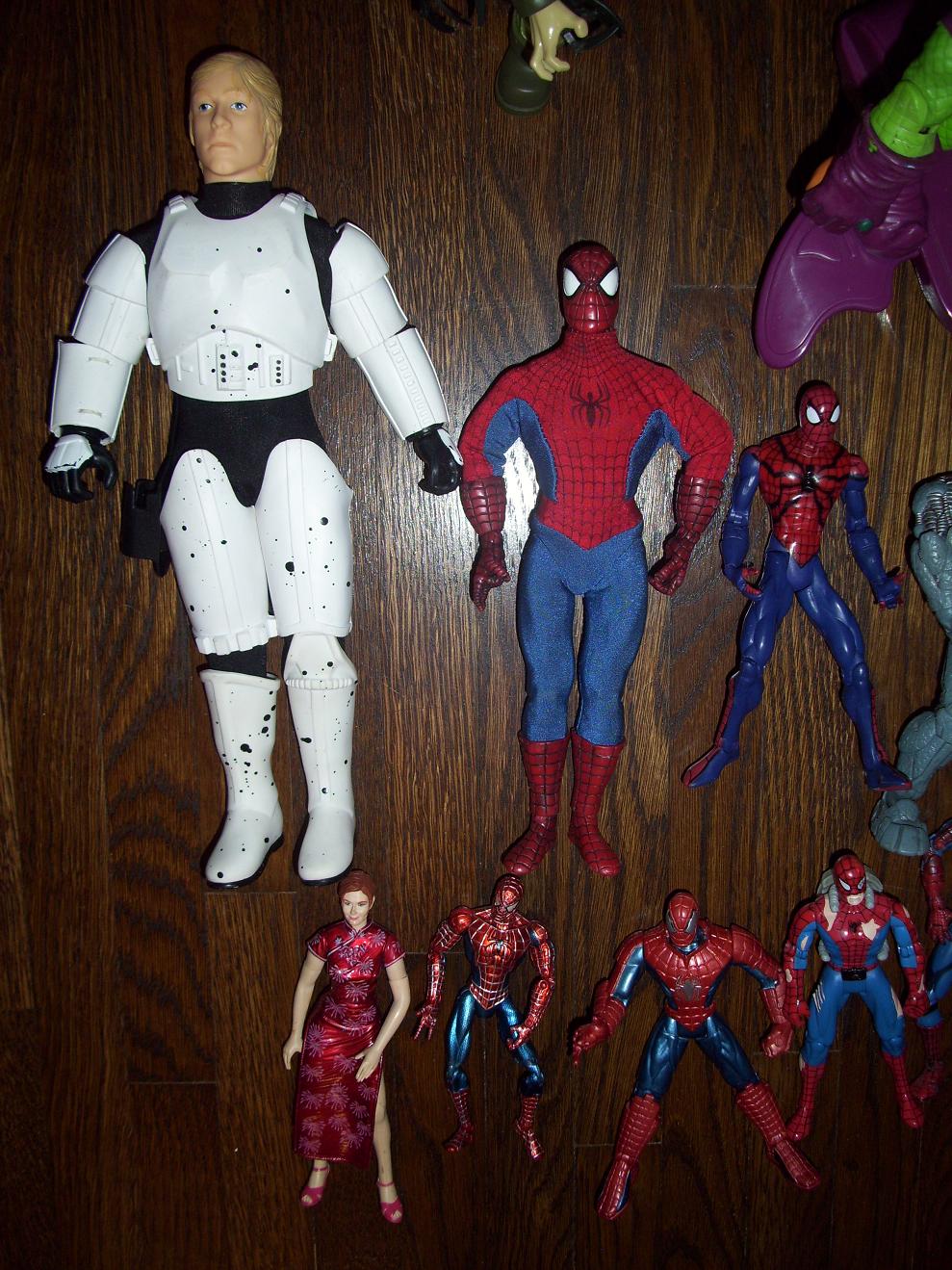 I am selling this lot of 35 action figures. You get 19 Spider-Man figures, 4 Jurassic Park figures, 5 Star Wars figures, a Narnia figure, 2 Indiana Jones figures, a Pirates of the Caribbean figure, and more. They are in great condition overall. Some have some minor paint rubs. Two of the Jurassic Park dinosaurs feature electronic functions that run on watch-size batteries, which they do not have, so I'm not sure if their electronic functions work. The batteries in the Pirates of the Caribbean set need to be replaced. The right shoulder plate on Rhino is missing. The chopsticks in the back of Mary Jane's hair broke off. I am asking $30 plus shipping for the entire lot.