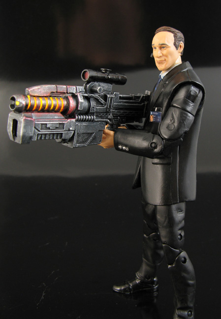 Agent Coulson is an important part of the Avengers team and along with Widow really needed a 6" studio figure. After finding Harvy/Wayne movie master figures on sale I knew what I had to do. His arms and legs are Marvel Legends Professor X limbs grafted onto the existing DC buck to give him double-jointed motion. Any good agent is going to need to dodge blasts from super villains and I kept the toe joint too. His head/hair was resculpted and facial features dremelled down. Coulson's earpiece and ID tag were added along with a SHIELD communicator. I printed out tiny vintage Captain America trading cards that you can actually read and laminated them. Coulson's Shield ID badge was done the same way with actual print and a picture. His Destroyer Rifle was made from a whole slew of fodder parts piece by piece and given a glowing paint job.