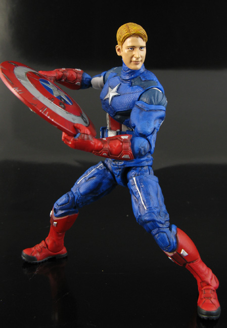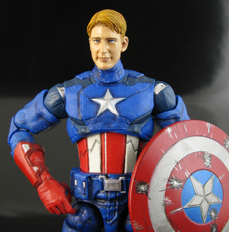 The Walmart exclusive 6" Captain America was nice but he was missing a ton of detail. Here I've taken the figure and filled in all the joint holes, completely repainted the figure adding washes, highlights, and details like the buckles, glove/boot trim, and soles of his boots. His alternate unmasked head was made from a FF Movie Flying Human Torch head (cause it's Evans!) with sculpted features and hair. There's a clean shield and an extra battle-damaged shield like the Hot Toys figure has. Now Cap can strut his stuff in style while taking on alien armies!