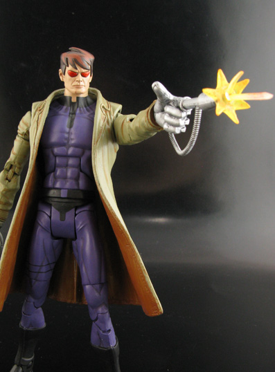 Aaron Stack the Machine Man from Marvel's Nextwave comic is an awesome character. Take Bender from Futurama's personality and stick him in a robotic Mr Fantastic and you have Aaron. I wanted to do his real justice for my first Machine Man custom! He's made from a DC Universe Captain Boomerang body/coat, Sandman Arabian Nights hands with modded slicy-fingers, custom sculpted head, and all sorts of fodder weapons/parts for his attachments. Those attachments include a lightsaber thumb, extendable arms, blaster hands, gun-finger with muzzle flash, and buzzsaw arm.