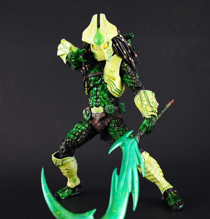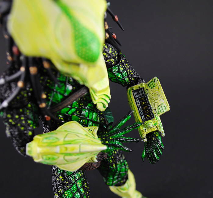The Hive Wars have begun anew and the Predators have joined in the fight against the ever-expanding xenomorph threat. Here I bring you the Acid Rain Predator wearing a specialized armor resistant to the acidic blood of the aliens. A brand new design, the Acid Rain Predator was created from the new AvP NECA body with tweaks to the armor using fodder from some Halo figures. He was given an all out repaint with different greens and yellows for the acid-washed look. Even his wrist computer has green numerics!