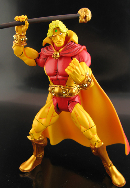 This classic version of Adam Warlock features a removable Soul Gem on his forehead. He was made from a Green Lantern/DCU body, ML Warlock head/cape, LCBH Conan hands/belt/two left forearm bracers, DCU Cyclotron lower legs, and staff made of fodder parts. Gold chrome bolts were added to his bracers and belt and he was given a bright color scheme just like he appears in the comics.