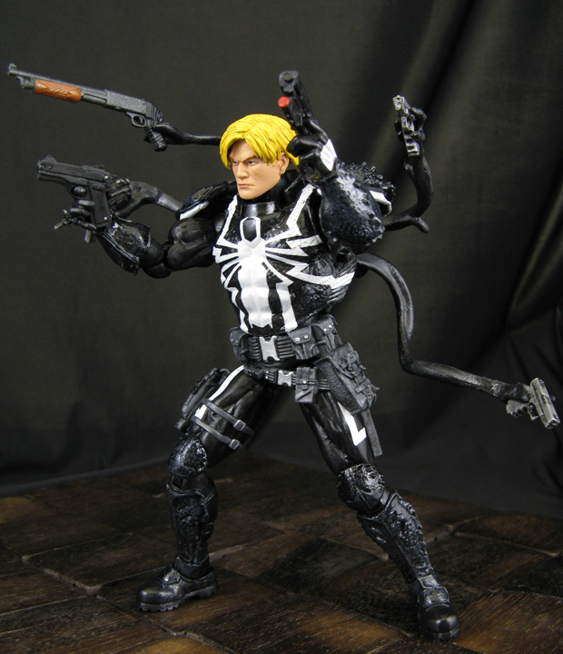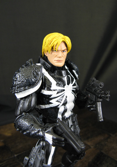 When the Walgreens exclusive Agent Venom hit he was a huge hit. Being such a popular character I decided to 'super deluxe' him here being more of an upgrade to the original figure than a full custom. Agent Venom has been repainted from head to toe such as glossy shell-armor sections with grey highlights, full belt gear paint work, and filled in joint holes for a seamless look. His right hip holster has been replaced with a working tactical one (original had a molded in place gun) and his belt knife sculpt replaced with a working sheathe. Two additional heads were crafted, the unmasked Thomson one from a Steve Rogers with sculpted hair and a symbiote venom face. More weapons were included as well as an extra back tendril which serves to hold them all like a 'weapons rack' behind him! Now this is an Agent Venom that deserves to be in the front of your collection.