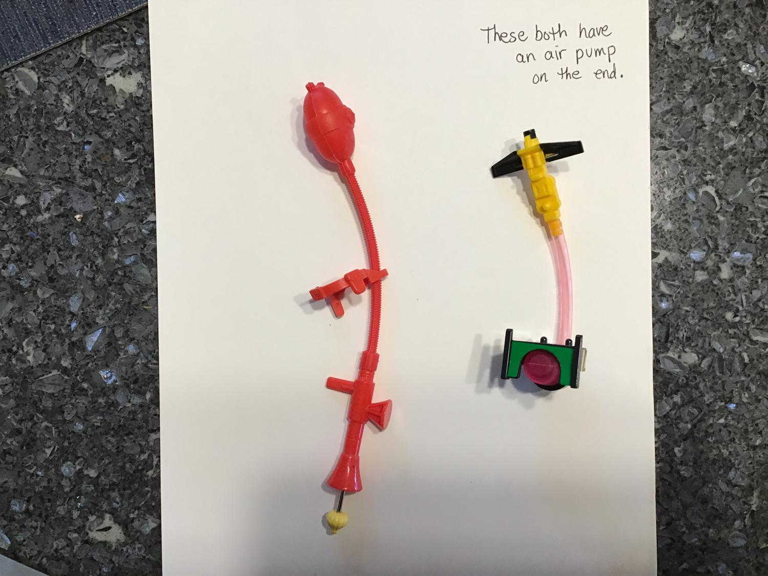 Both toys use an air pump to work. The red one when pumped makes the yellow end come out. On the other one, the purple diaphragm gets pushed down somehow to push air out the black and yellow end. Thanks for any knowledge about these two.