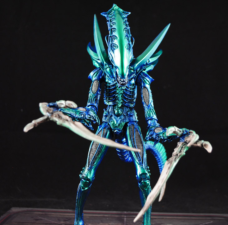 Straight out of the AvP Extinction video game comes the fearsome Ravager Alien Warrior! These bladed aliens are a unique and powerful class of Xenomorph that can shear through armor and hack into its prey. This week I give you one of these Ravagers to add to your collection. He was created using an NECA Mantis Alien base, warrior lower legs, Dog Alien tail ends, and star wars Acklay beast claws. The head was resculpted and given additional tubing along with a new tail and Mantis feet swapped onto the new lower legs. Tetors Aztek Airbrush paints were used, the metallics specifically for a dual blue/green faded look with bone highlights.
