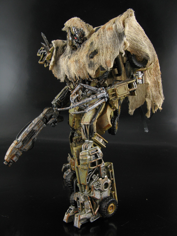Megatron's cloak-tarp was tailored from an all cotton linen weave bought at Jo Ann's crafts and tie down straps were added after giving it a good weathering with different shades and splatters. A dip into water allowed it to hang on his robot mode and then when dry I used a mixture of water and clear sealant to get it to stay that way. The weathering the entire vehicle/robot modes were hand painted and given airbrushed, splatter effect, and line-detail rust along with various metallics before a sealer coat was added. Megatron's shotgun was made from a Gears of War gnasher with extra parts, a new handle, and hoses added.