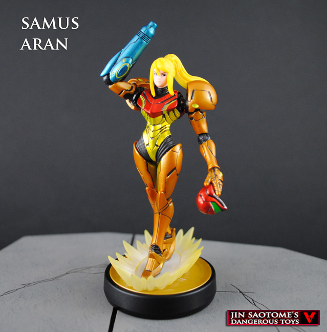 The Nintendo Amiibo characters are nifty little statues and here I've added articulation and a special twist to one, Samus Aran! When the Zero Suit Samus was released I knew what I had to do, an unmasked Samus. Using mini ball joints I made Samus' power suit helmet removable so you could swap on the Zero Suit head. I added shoulder and arm joints so she could aim her arm cannon around and even a tiny magnet inside the helmet so she could hold it in her left hand. A beam effect was added and I repainted the Zero Suit Samus into the black alt costume, giving them both power-up bases. They still work with the Wii U and are now unique Amiibo figures!