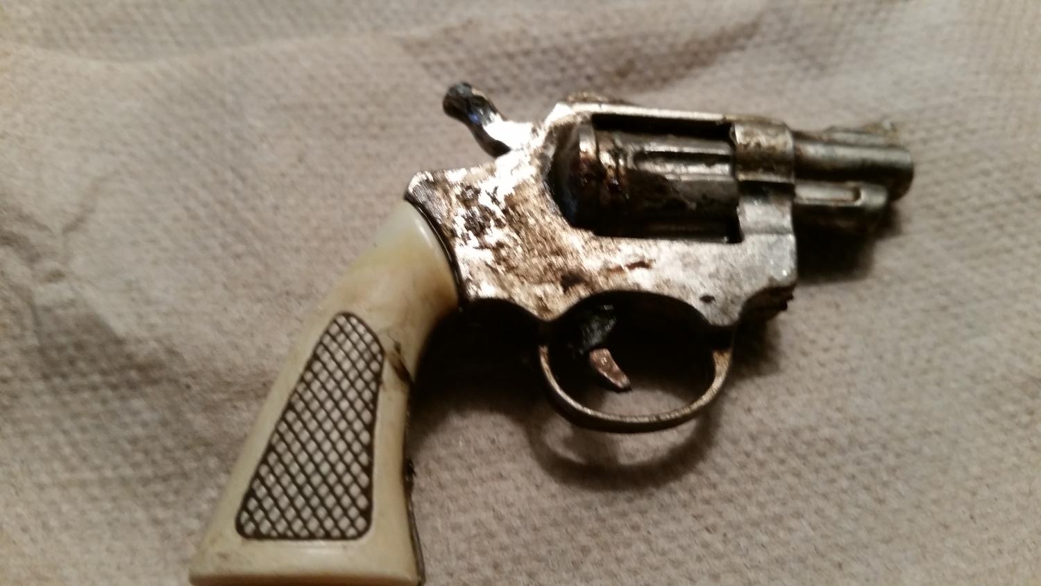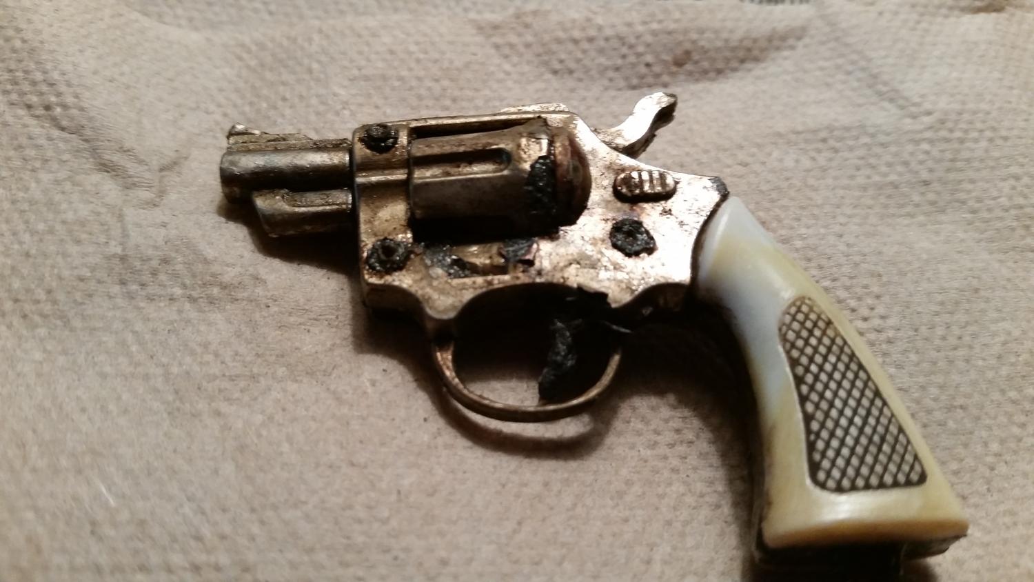 I recovered this miniature toy revolver while metal detecting a vacant lot. It was still in a little holster, however the holster had to be destroyed in order to get the pistol and packed dirt out of it. I've examined this piece with a loupe but can't find any markings. Anyone have any ideas?