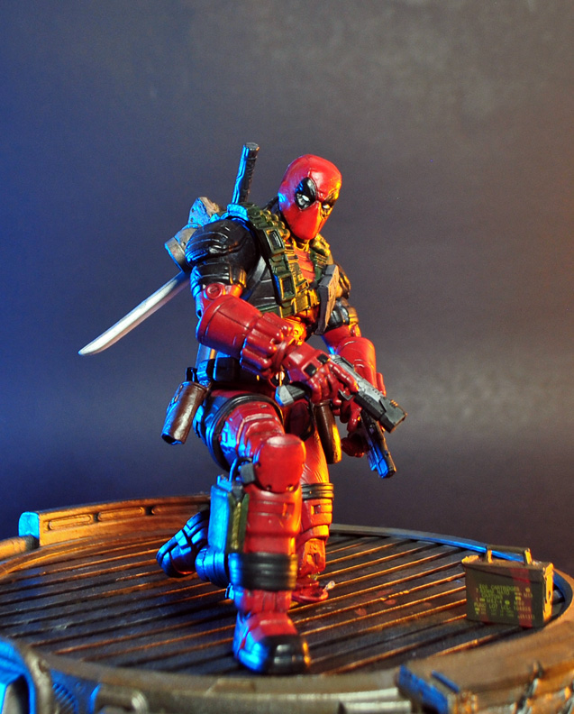 When bullets start flying Deadpool is like an ammo-sponge getting himself shot up every time he's out doing his thing. Well not anymore! When the job requires the merc-with-a-mouth to be the merc-with-the-mechanical-muscles Deadpool dons his armored outfit equipped with everything he needs to keep his uniform intact. Ripped in half by the Juggernaut? Not this time! Blown to pieces by explosive barrels? That just tickles! Armored Deadpool was created by using a DC Collectibles Batman vs Superman body, One:12 collective Deadpool head, Genji hands, Titanfall pilot accessories/pouches/gear, and Samurai Spawn swords. The entire figure was weathered and detailed for a movie look and given a Liquitex varnish sealant.