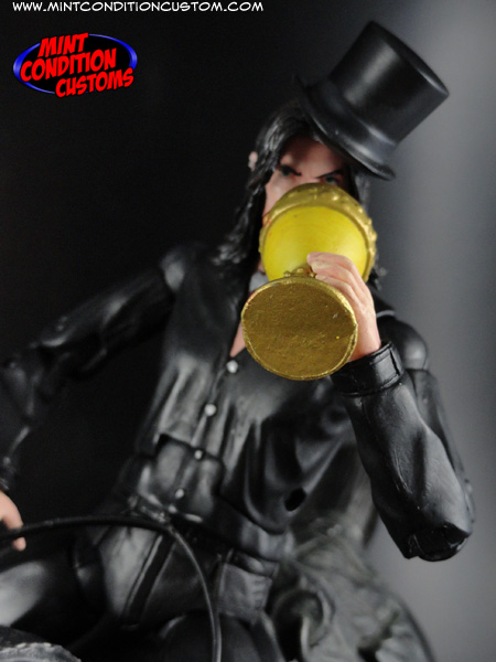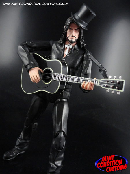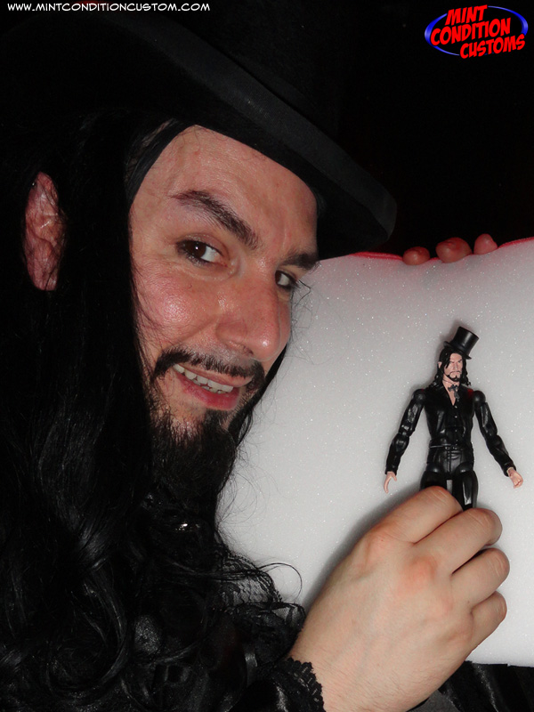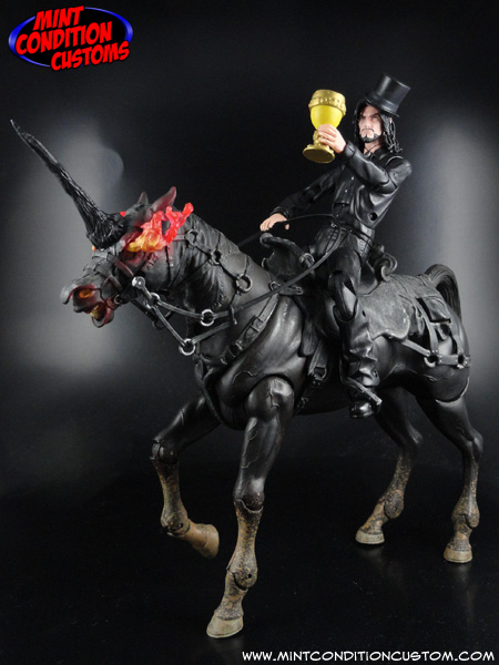 For my 100th custom, I wanted to do something special. Seeing as how my favorite musician, Voltaire, was coming to play a show near me, I decided to surprise him with a custom action figure of himself. For those who don’t know who Voltaire is, he’s a gothic folk singer. Almost all of his songs are comedic in nature, usually lightheartedly poking fun at the gothic subculture, or at least how most people would consider gothic people to act. A fan of his once aptly described his music stylings as akin to “Riding a Black Unicorn Down the Side of an Erupting Volcano while Drinking From a Chalice Filled With the Laughter of Small Children”. Voltaire loved this description so much, he used it as the name for one of his albums, even going so far as to write an entire song revolving around that title. The custom set I made him revolves around his “Black Unicorn” album. The actual figure itself was made using the body of a Diamond Select Toys Deluxe Angel, the head from a Marvel Legends Dr. Strange, the hair from a Lord of the Rings Boromir, and the top hat from a DC Universe Classics Zatanna. I resculpted the collar of the shirt so it would be more open, and made a smaller version of Voltaire’s signature key blade necklace myself out of carved down polystyrene strung around the figure’s neck with black thread. I also heated up the figure’s left hand and let it cool down around the chalice I gave the figure, so it would perfectly fit in his hand. The reason I chose the ML Dr. Strange head is actually a funny story. Not many people know this, but that figure’s head was actually sculpted after Voltaire’s likeness. A friend of his was working on the figure for Toybiz many years ago and thought that Voltaire had the perfect face for him to use as a reference for Dr. Strange’s face. So with that knowledge, how could I possibly use any other head, but one that was made to look just like him? I had to sculpt his full beard on, and shave down the back of the head greatly to fit the Boromir hair on, then just glued the top hat to the hair. I also used thin styrene rods to pierce both of his ears. And for the coup de grace, the black unicorn. I used a Lord of the Rings Ringwraith Horse for him, and used part of a Gandalf cane for his horn, that I sculpted over to blend in with the head. I took some flame accessories in my fodder bin and glued them to either of the horse’s eyes, and painted the flames so they would fade to red. I also painted the horse’s nostrils and mouth to look as if they were glowing fire, and dry brushed some red around the horse’s head to simulate the flames glowing against it. After the bulk of the work was done, I gave the figure several accessories. I included a chalice that came with the same Deluxe Angel figure that I used for the body (and yes I filled it with the laughter of small children). A beer bottle was given to him as well from a Spike (from Buffy) action figure. The guitar came from a NECA Johnny Cash, the guitar case came from an Alias action figure. His chair came from a movie Spider-Man Norman Osborn figure that I had to fill in part of with apoxie sculpt, and then completely repainted it a red leather color, and gave the legs a rustic worn wooden look. And after all of that, the figure was finished. I presented the entire set to Voltaire on July 22nd, 2012. From what I gathered, he was very grateful for the gift, which alone makes it completely worth it. If you’d like to find out more about Voltaire and his music, here’s a few links to help you out: Voltaire | voltaire.net | NEWS The Lair of Voltaire -OFFICIAL - YouTube https://www.facebook.com/VoltaireFanPage ![]() ![]() ![]() ![]() ![]() ![]() ![]() ![]() ![]() ![]() ![]() ![]() ![]() ![]() Thanks for looking! Last edited by Joe Moore; 01-08-2013 at 07:37 AM.. |