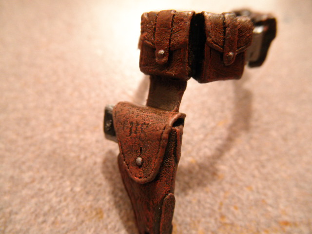 Some closeups of the belt, went for a nice worn leather look, the flap buttons and rear grommets were toughies too! I drilled a tiny hole in the hand grip of the pistol and painted it steel to accurately replicate the screw that hold the grips to the handle: