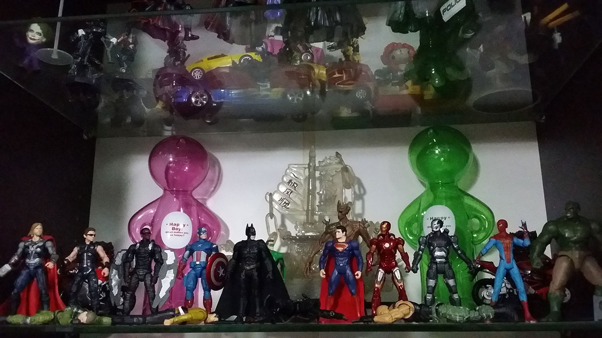 The shelf is split by the two opposing superhero factions. Team Batman on the left and Team Superman on the right.