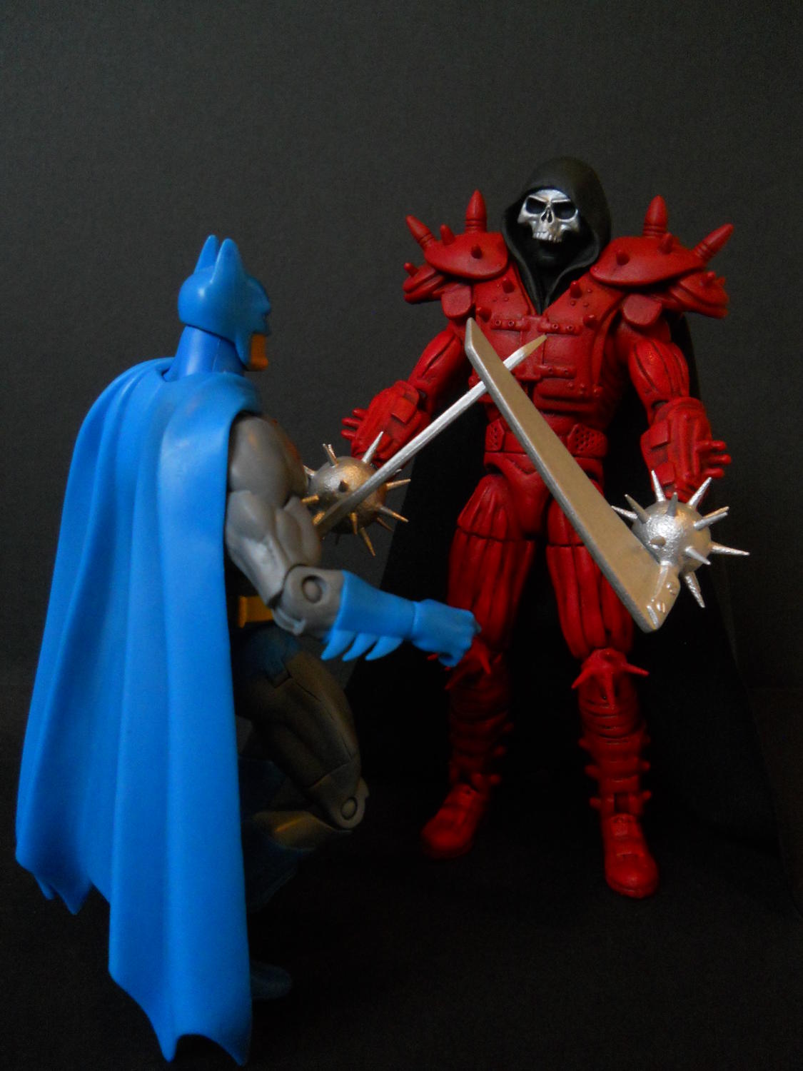 The Reaper started out as a Marvel Legends Grim Reaper that I bought on Clearance for $5. His Shoulder Pads, Boots and Gauntlets are from a Create a WWE Superstar set. The details on his costume are all hand sculpted from Miliput. His Hood came from a Funko Legacy Magic figure and the Skull Mask was a charm that came attached to a bottle of hot sauce. The Bladed Mace Gloves are balls of Miliput with ML Grim Reaper Blades attached to them. The Spikes on his Maces and his Kneepads are the tips of Toothpicks that were superglued into place. I painted him all black and dry brushed on a bunch of layers of red acrylic paint. Finally his cape was cut from a black athletic shirt and glued onto his shoulder pads. He’s not 100% accurate to the way he appears in the comics, but I’m still pretty happy with the way he turned out. Thanks!