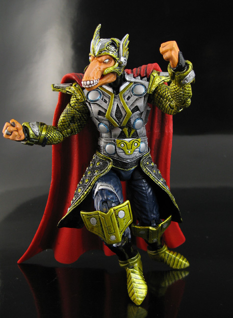 As you may know I'm doing a whole series of Avengers movie figures, characters you saw and didn't see. Here's Beta Ray Bill as I figure he may look in say, Avengers 2. He was made from a movie Thor, ML Beta Ray Bill head with various fodder armor/helmet sections added (probably LotR), Dr Doom feet, DCU Skallox hands, and a 3 3/4" Avengers Thunderstrike weapon fashioned into Stormbreaker. Some people love the character, some poke fun at his horse-ish looks, but I'm really liking how this figure turned out. Beta Ray Bill is ready to take on the universe, movie-style!