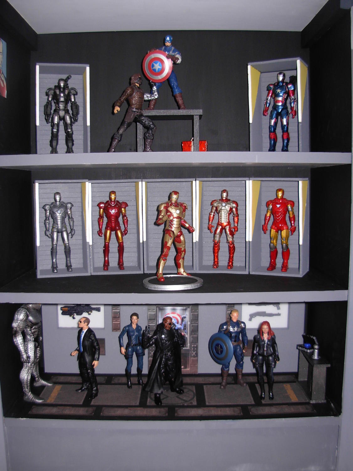Avengers tower is a work in progress, as is my MCU collection. I still need to finish the landing pad, refine the armor stands, etc. etc. I collect most 1/12 scale movie figures. Once the tower is done Ill move on to other shelves. Probably a Gotham PD for the DC Movie Masters Figures, then something cool for the Black Series.