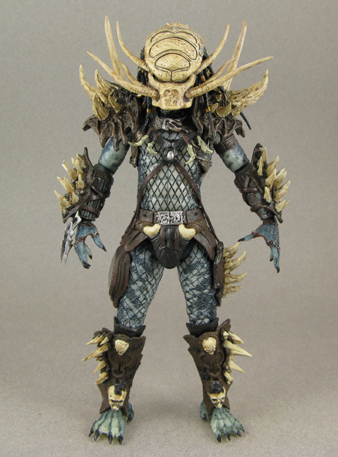 I've wanted to do more unique custom Predators and found some NECA ones on sale at Essex bargain Hunt as well as local comic shops. Using any Predator as the base, the blue-skilled Lost Tribe one here, I affixed various fodder Spawn armor (Raven Spawn and some bone-armor one) for the Bone Collector's armor. Straps, a new waist/chest piece were added, and spikes from a Preadators Hound were added on to the mask to make it look bone-crafted. Now this is one spikey Predator that takes his trophies with him on the hunt!