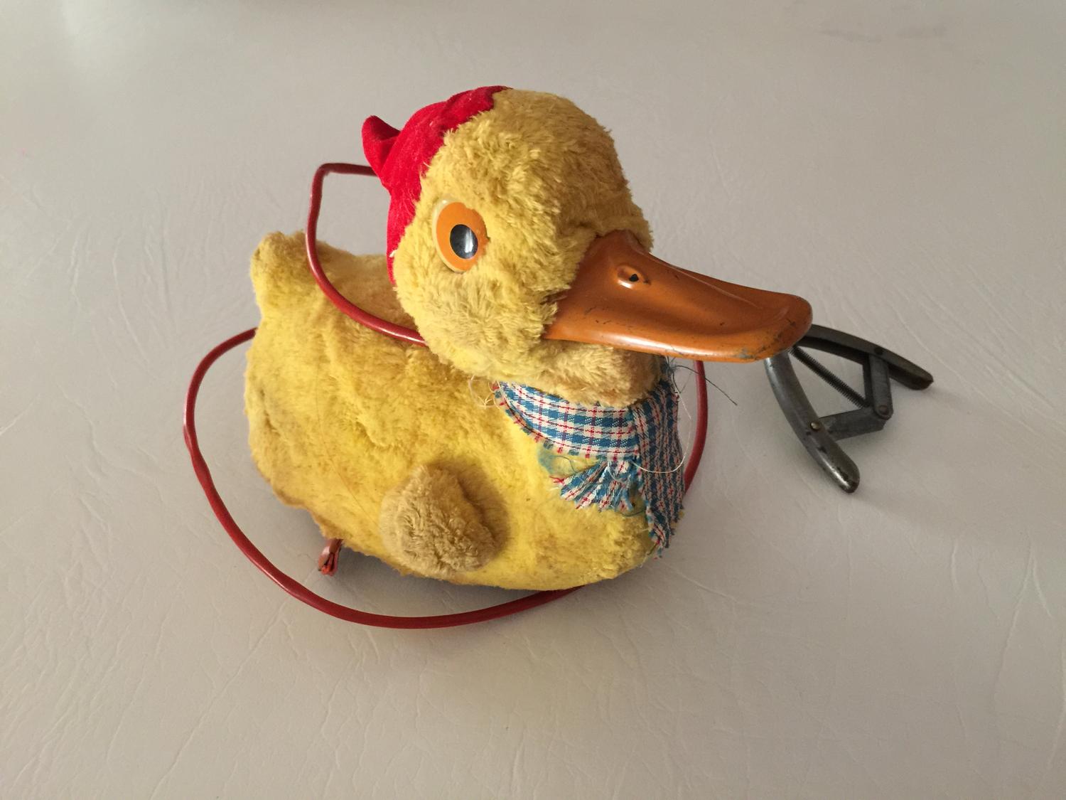 I recently got this vintage duck toy in a lot of things from the 50's & 60's at an estate sale & I can't find it anywhere in my research! Aside from what you see in the photos, here's what I know about it: It is labeled RVT Made in Japan on the bottom. I believe this to be Rock Valley Toys, but I'm not certain. When the metal handle is squeezed, the tin beak opens, the wheels turn (causing the duck to move forward), & the toy makes a sort of quacking sound. It isn't a pull toy as the 'cord' comes out of the back of the neck & the operation requires no batteries. I believe that it's made of tin, but I'm not certain about that, either. I'm hoping that someone can help me to shed some light on this cute little duck! Thanks :-) Julie