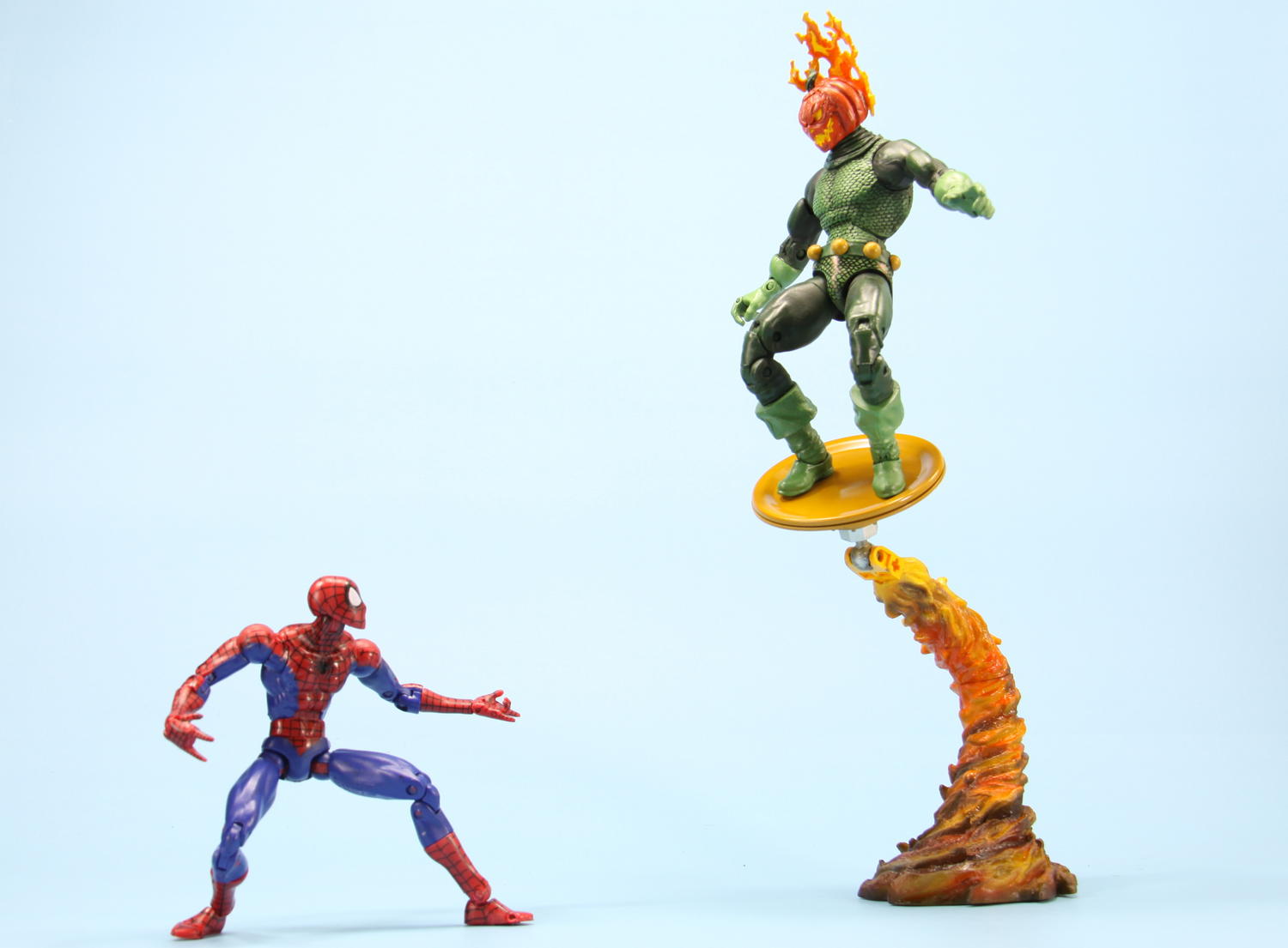 Another figure that needed to be done! A CLASSIC Jack O' Lantern! You have your Classic Hob Goblin, your classic green Goblin, even a great DEMO- GOBLIN, but WHERE is a Classic Jack O' Lantern?@?@??@ Jack O' Lantern Features MAGNETIC Feet so he can stick to his Flight Disc! His Flight Disc has a Metal Top! Jack O' Lantern's Flight Disc attaches via Ball joint to a Flame Flight Stand as well (great for Displaying!) Figure Also Comes with a Pumpkin Bomb! Jack O’ Lantern Recipe: Head: Spiderman Jack o' Lantern Rescuplted Torso: DC Universe Aquaman Upper Arms: DC Universe Gloves: Punisher Legs: Ricky the Steamboat Boots: Bucky Cap Belt: vinyl & Airsoft BB's Pumpkin: Marvel Super Heroes Green Goblin Hover Disc: Robotix part and Canning Lid Flame Stand: Movie Human torch Ball Joint: Bionicle Up for sale on Ebay:packratstudios | eBay For a Gallery of pics Check out my FaceBook or Blog: https://www.facebook.com/pages/Pack-...9031803?ref=hl packratstudios |