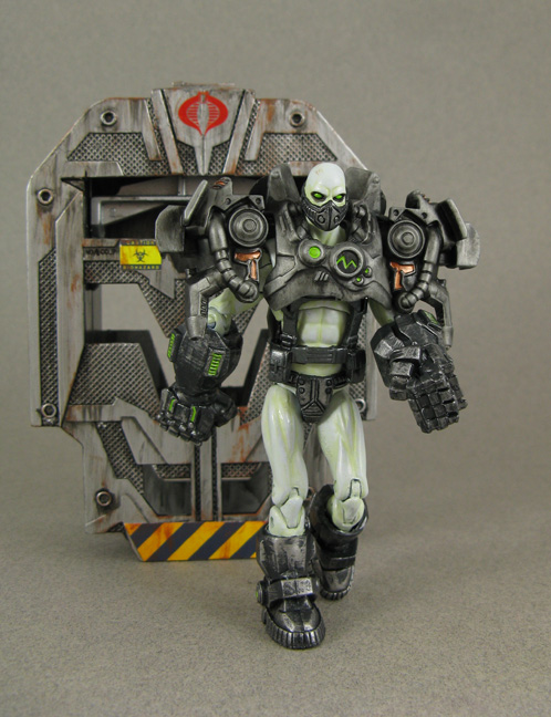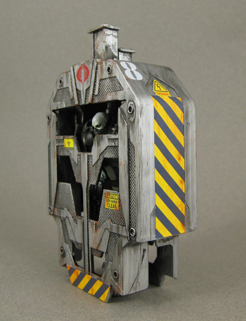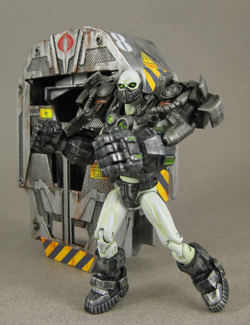 Another Batman TDKR Quick-Tek launcher box was used for this Cobra Crusher Clone. The box was weathered up and I printed out some nifty caution stripes/danger signs to detail them with. The Cobra Crusher was made from a Marvel Universe Silver Surfer, 3" Wreck it Ralph Hero's Duty hands/feet, sculpted breather/waist covering, with an iron man 2 Hydra good harness and Bane's punch-armor from the Quick-Tek unit modded to fit. Crusher pops in and out of the box from the bottom when you 'load' it on top or depress the button to drop him into battle. Time to make more clone containers!