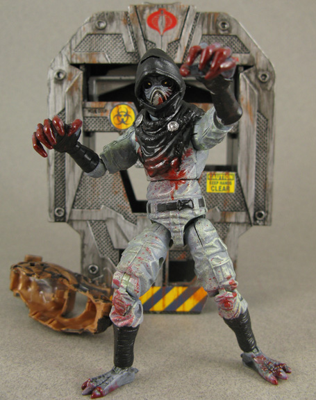 Another Batman TDKR Quick-Tek launcher box was used for this Cobra Hunter Mutant. The box was weathered up and I printed out some nifty caution stripes/danger signs to detail them with. Cobra Hunter was made from a Zombie Viper body, Mum-rah hands, Luke Skywalker vs Clone Emperor lower arms, Storm Shadow lower legs, Mortal Kombat Reptile feet, ROC Storm Shadow sash, Retaliation Zartan hood, and a head from another Star Wars figure.