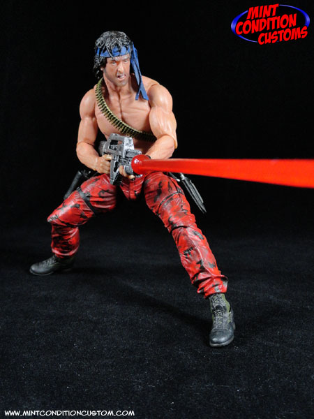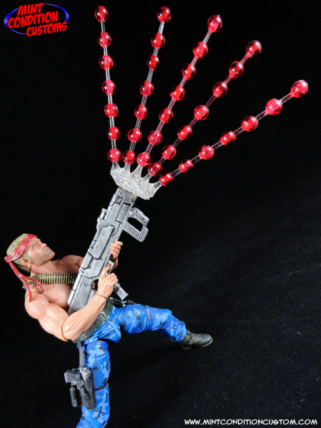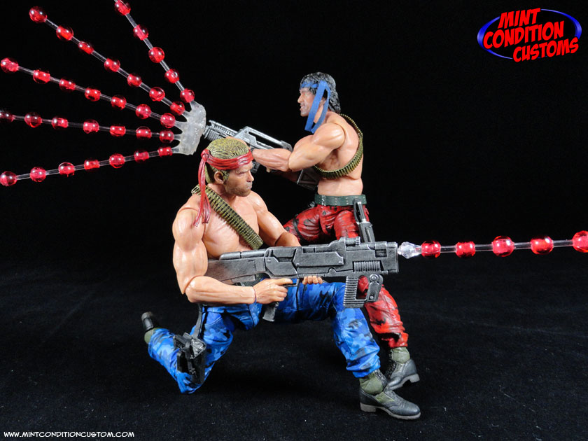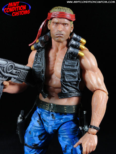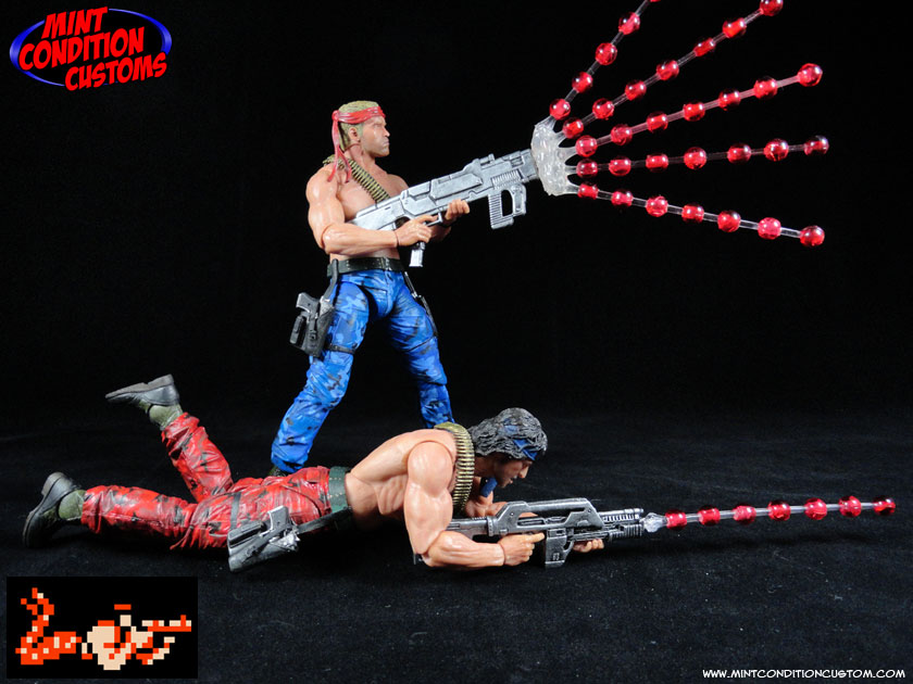 They were each made from NECA parts. The bodies are NECA Jungle Encounter Dutch, the head for “Mad Dog” is Dutch, and the head for “Scorpion” is from a NECA Rambo. I had to paint over the blood on Rambo’s forehead, and the camo paint on Dutch’s face and match the flesh tones to the figure bodies. I used parts from the sash of a Hasbro Marvel Legends Elektra for Mad Dog’s headband. Their pants were repainted their respective red and blue to match the game sprites, but done in a realistic camo pattern. Mad Dog’s gun comes from a Marvel Legends Hope Summers, and Scorpion’s is cobbled together from a NECA Aliens pulse rifle, and some other fodder guns, and both were painted black and then dry brushed with Citadel Mithril Silver. And then finally I gave them their classic weapons: The Spread Gun, Machine Gun, and laser. They were pieced together from clear acrylic rods and beads, and can be swapped between the guns via pegs on the ends of the weapons. And now my movie concept Contra figures are ready to take down the Red Falcon Organization! ![]() ![]() ![]() ![]() ![]() ![]() ![]() ![]() ![]() ![]() ![]() This is also currently up on eBay for those interested. You can find the link in the EBay Auctions section of these forums. Thanks for looking! |