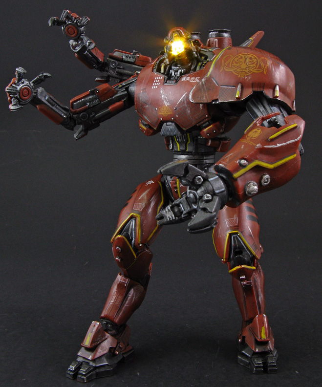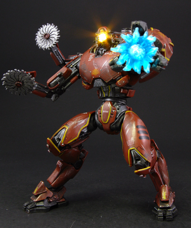 This custom NECA Pacific Rim Crimson Typhoon figure is ready to battle the Kaiju with various modifications to the original figure. All the single direction arm hinges were removed and replaced with full motion universal joints including the wrists so Crimson Typhoon can cross its arms for blocking or strike with them. The removable saw hands came from Transformers mech-tech Ratchet's weapons and the larger one from an Ironhide Bot Shots trailer. Crimson's ankles were given ball joints as well so he could be posed to side-step incoming attacks. The mono eye was drilled out and given a light-up LED eye that shines in a spotlight effect just as it did in the movie. Extra sculpting detail was added on all the arms, body, and torso, then the entire figure was repainted with various armor shades, weathering, battle damage, and tiny lighted dots. Add a plasma blast effect and Crimson Typhoon is ready for his one minute of screen time and woeful defeat!