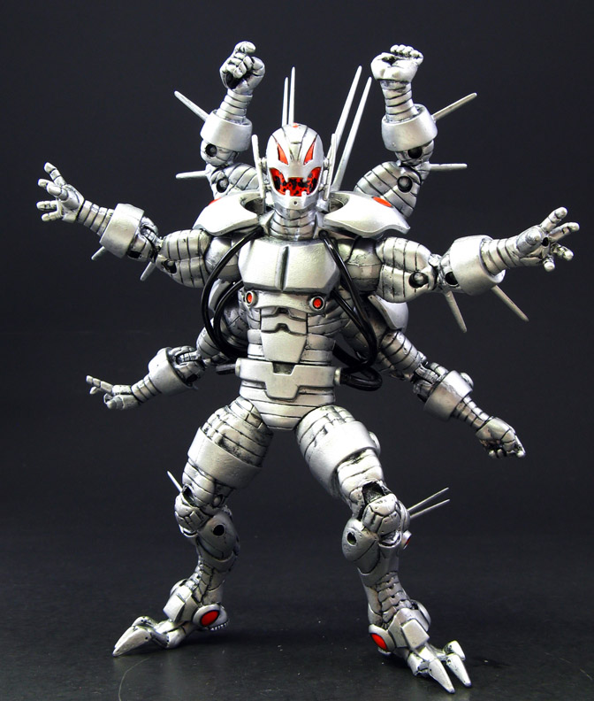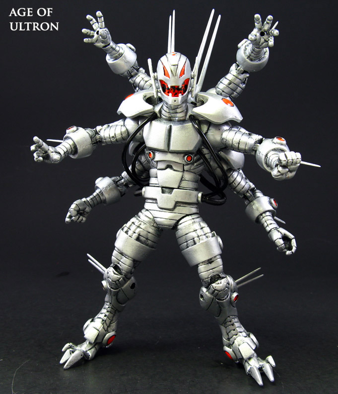 The Age of Ultron is in full swing so here's a custom Ultron Marvel Legends figure based on the six-armed teaser custom we saw at the SDCC 2013 in the Marvel Universe diorama. Three Iron Man Legends Ultron figures were needed (or one Ultron and two Titanium Man figures as they share the same limbs) with the new limbs attached to his back, different style revoltech hands added, additional Modeling Support Goods ports added, spines, spikes, and the lower legs from an old Toybiz Marvel Legends Ultron. I was even able to find the back piece the SDCC custom used, the wrist gauntlet of a 5" Spiderman movie Scorpion and attached various extra hoses to him. A few blast effects, energy blade accessories, and detailed metallic paint job later, Ultron is ready to wipe out humanity once and for all!