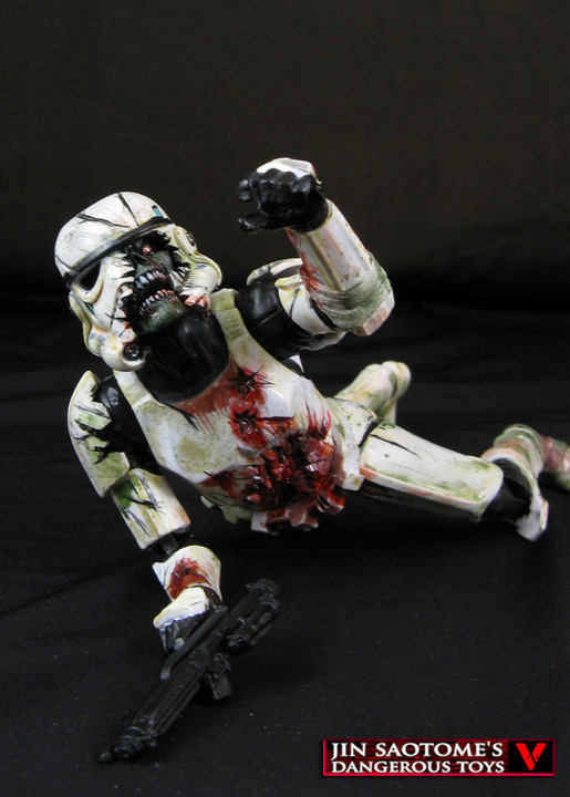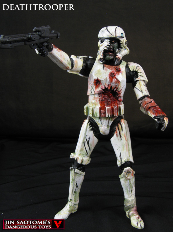 They shamble, they groan, they have better aim dead than alive, it's the Deathtroopers! Straight from the Star Wars novel aptly named 'Deathtroopers' this figure was created much like the first one using a Star Wars Black series Sandtrooper with a hollowed out helmet that fits on top of a modified Face Off Marvel Legends Red Skull head. The torso was opened up and organs sculpted in along with the arm bites. Quite a few different paint effects were used to simulate the art of fungus covered, dirty, stained trooper armor with actual cracks and chunks taken out of it along with dirty bandages. Watch out, the Death Troopers are on the move...