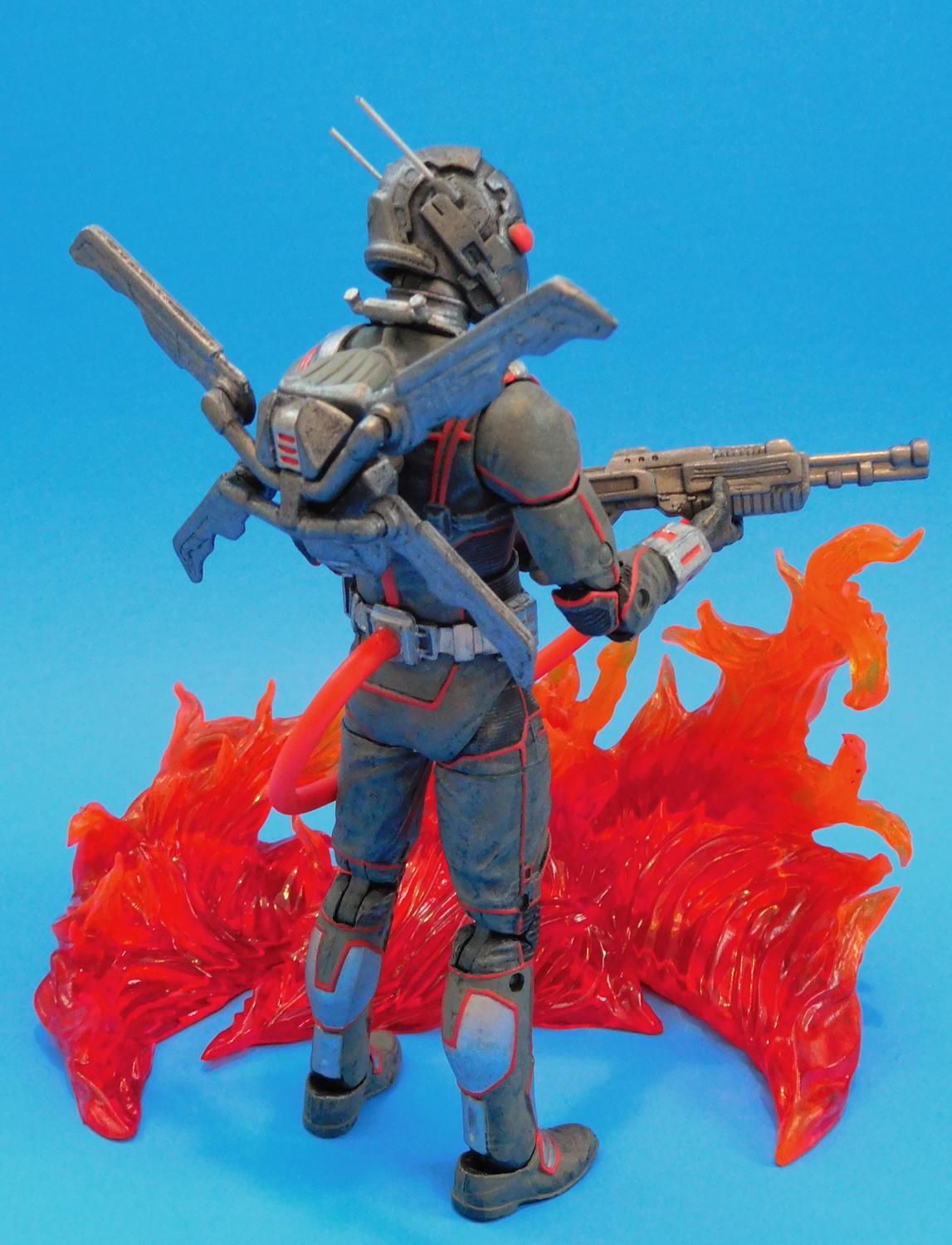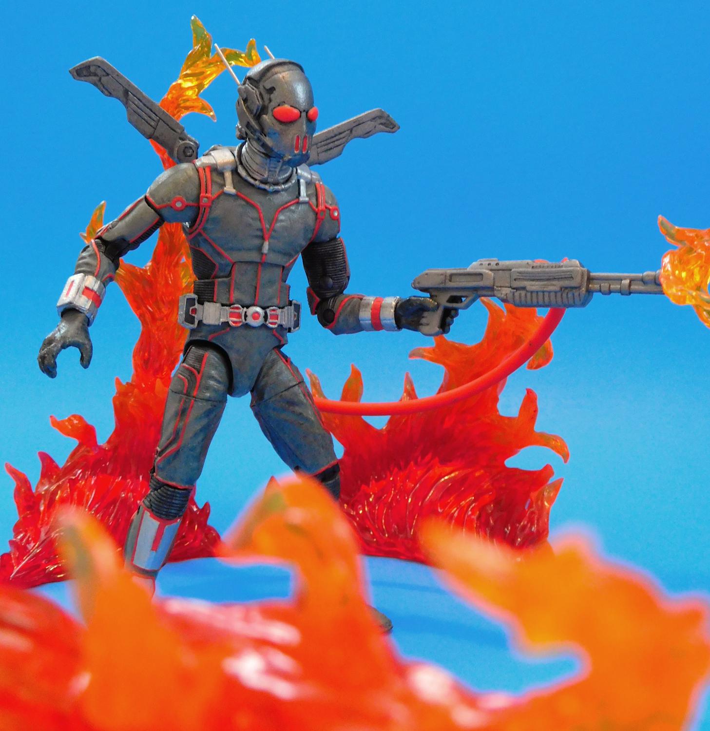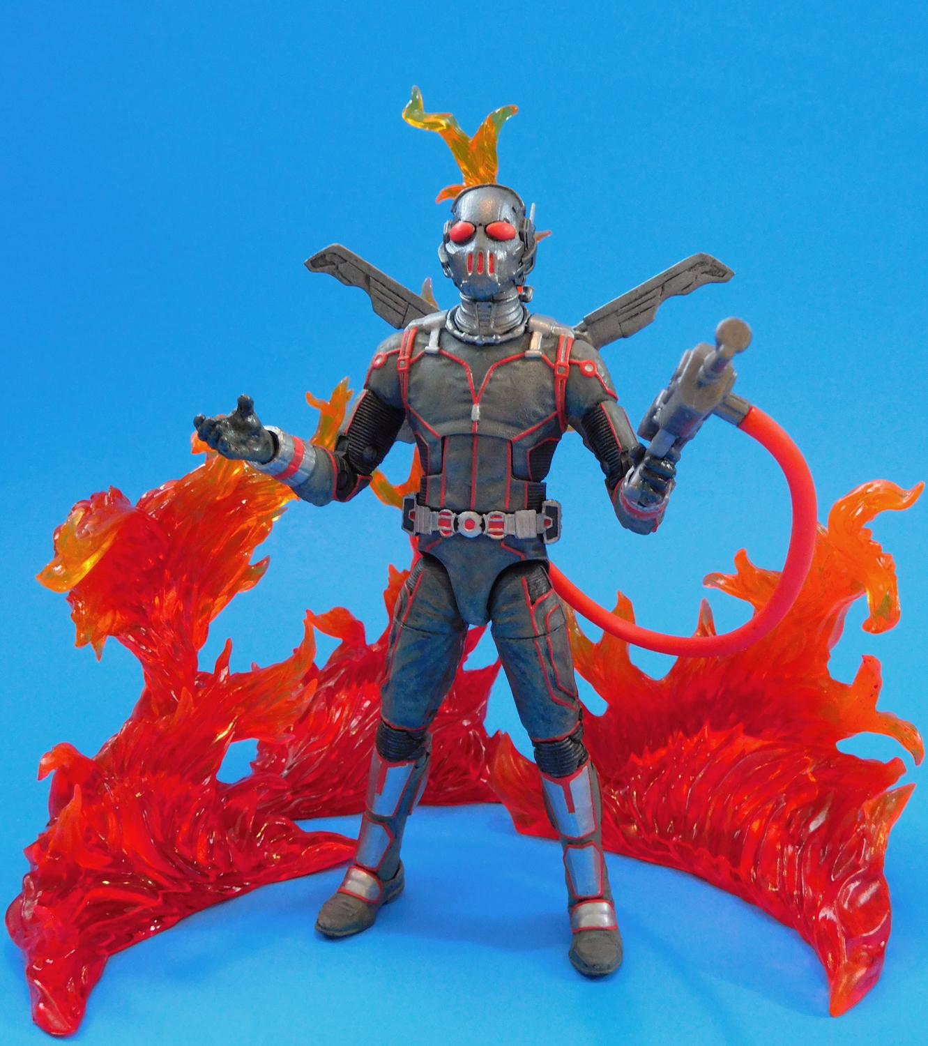 If you do a Google Image Search on Firefly, you'll find he doesn't really have one definitive, classic look. A lot of his suits are all Grey or Silver and the helmet usually has antennae, bug eyes and vents at the mouth. There is lots of room for interpretation. At first I was going to use Orange paint to break up the monotony of the all-grey costume, but I wasn't crazy about they way it turned out and went with Red for the highlights after I found the Red Plastic Hose in my Fodder Bin. This custom Firefly figure began life as a Movie Ant-Man figure I bought on Clearance for $5. I used Milliput to sculpt over the eyes on the helmet and the exposed part of his face. I cut off the little antennae and replaced them with long metal pins. The Winged Jet Pack came from a Funko Legacy Val figure from a video game called Evolve That I also found on Clearace. The Flamethrower is from a generic G.I. Joe (or G.I. Faux as I like to call them) and the Flamethrower hose came from a Batman Legacy Mr. Freeze (Irony). I repainted him from head to toe with Black, Grey, Silver and Gunmetal Acrylic Paints. I mixed Red, Yellow and Orange Paints to better match the color of the Flamethrower Hose and used that for all the red details on his costume. Thanks for looking! |
