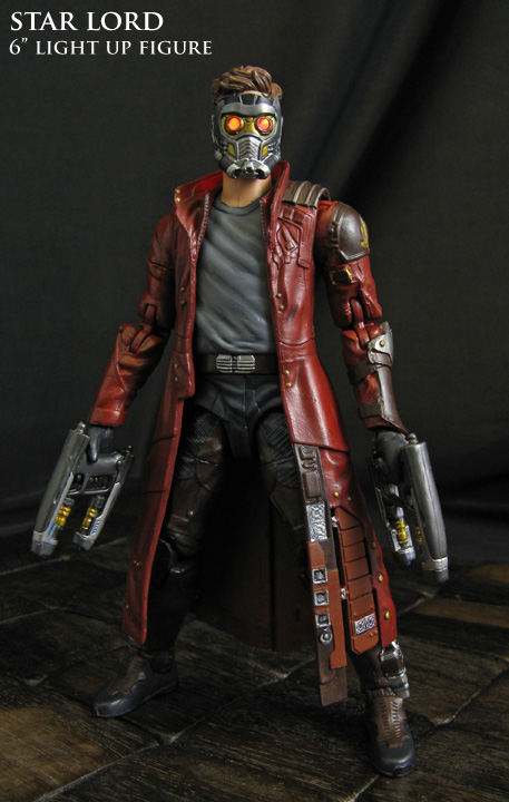He's dashing, he's daring, he's thieving, it's Peter Jason Quill aka: Star Lord. Here I've gone all out creating a unique custom Marvel Legends Guardians of the Galaxy movie Star Lord with light-up eyes. I used the normal Legends Infinite figure and hollowed out/resculpted the torso installing a clear neck post that channels the LED light up into the head that was modded with clear eye ports linking to the neck post. Depressing the button on his back make the eyes light up bright red like in the movie! Star Lord also features a complete hand painted, screen accurate costume from his armor down to his tiny boot buckles.