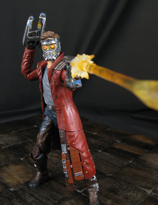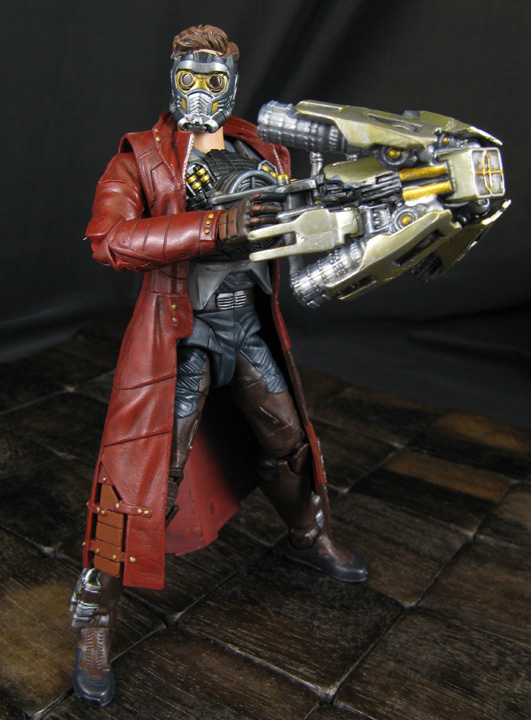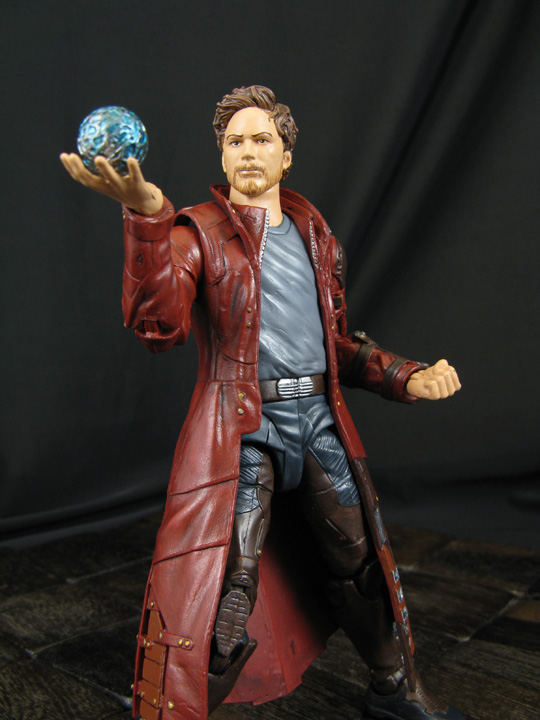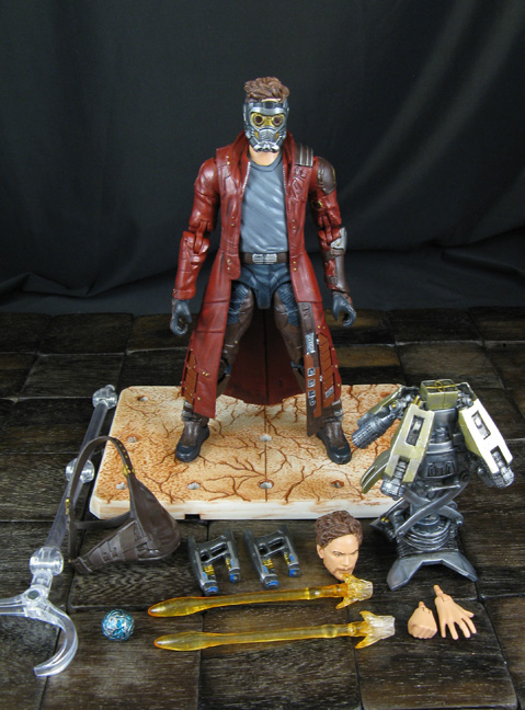 A set of human hands were added, all his accessories detailed, snap-on blaster effects, wired headpones/walkman, orb, and a detailed chest cannon included that came with Rocket Raccoon. I repainted the alternate head as well and modded it to fit the new neck and gave his masked head a complete paint detailing job. Throw in a flight stand base, the mysterious orb, and Star Lord is ready to take on any cosmic threat that comes his way. |