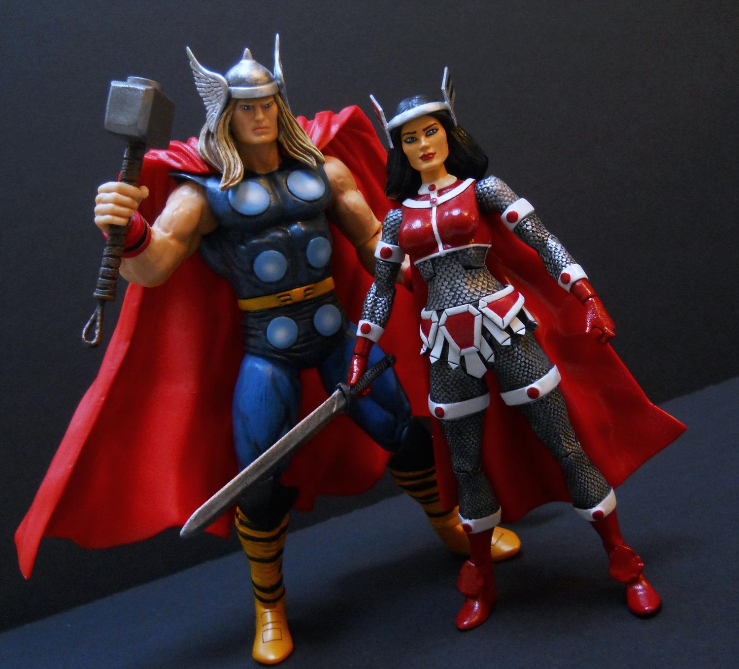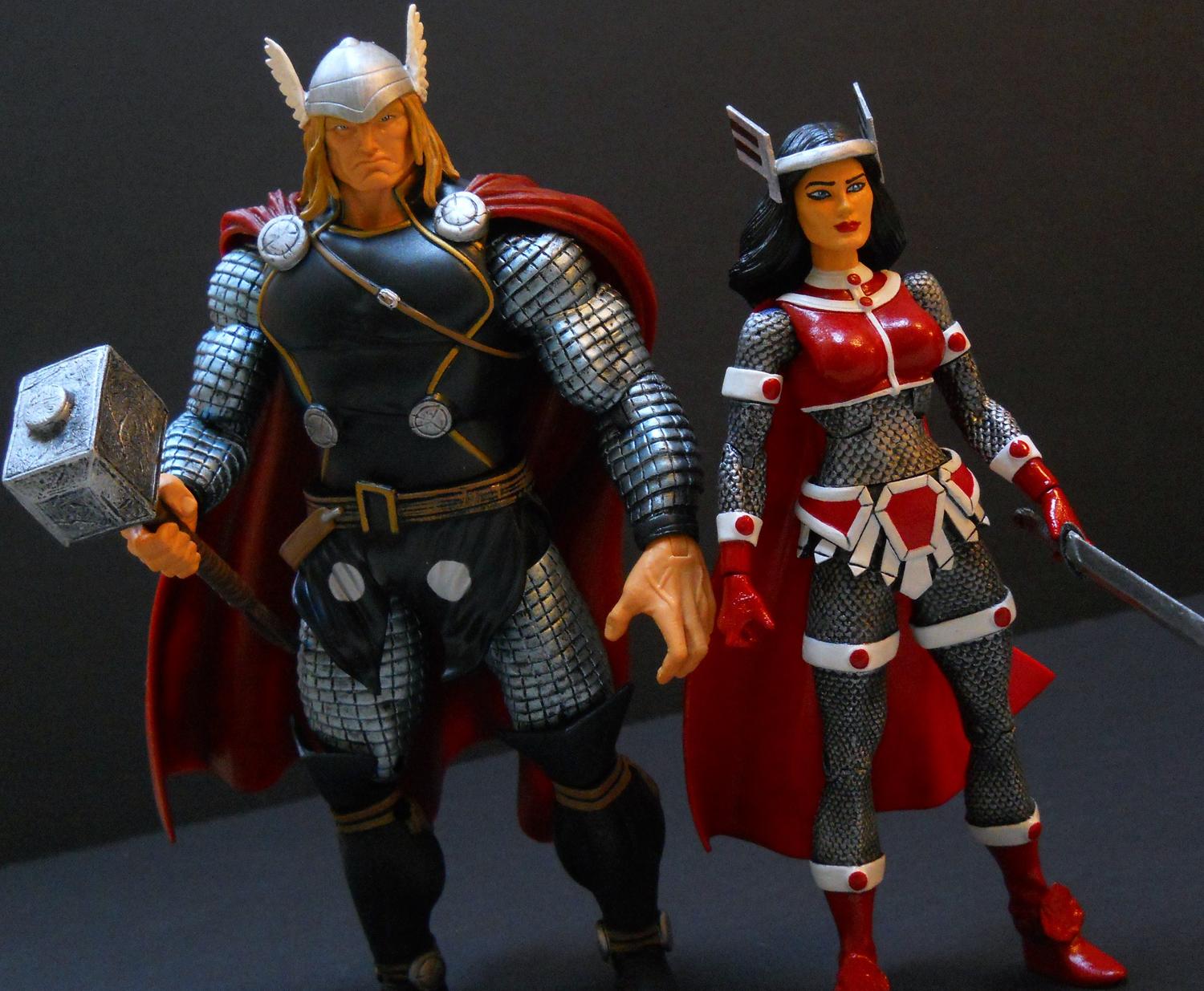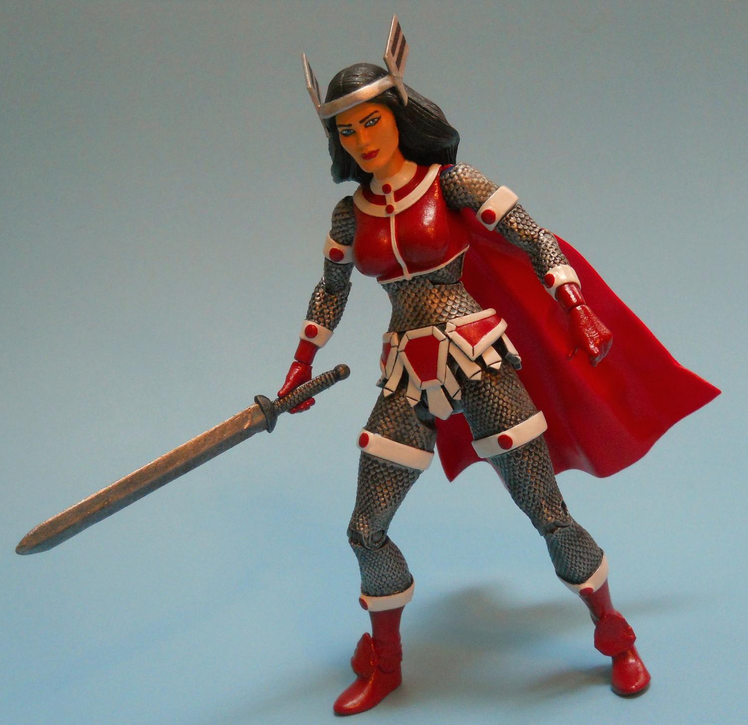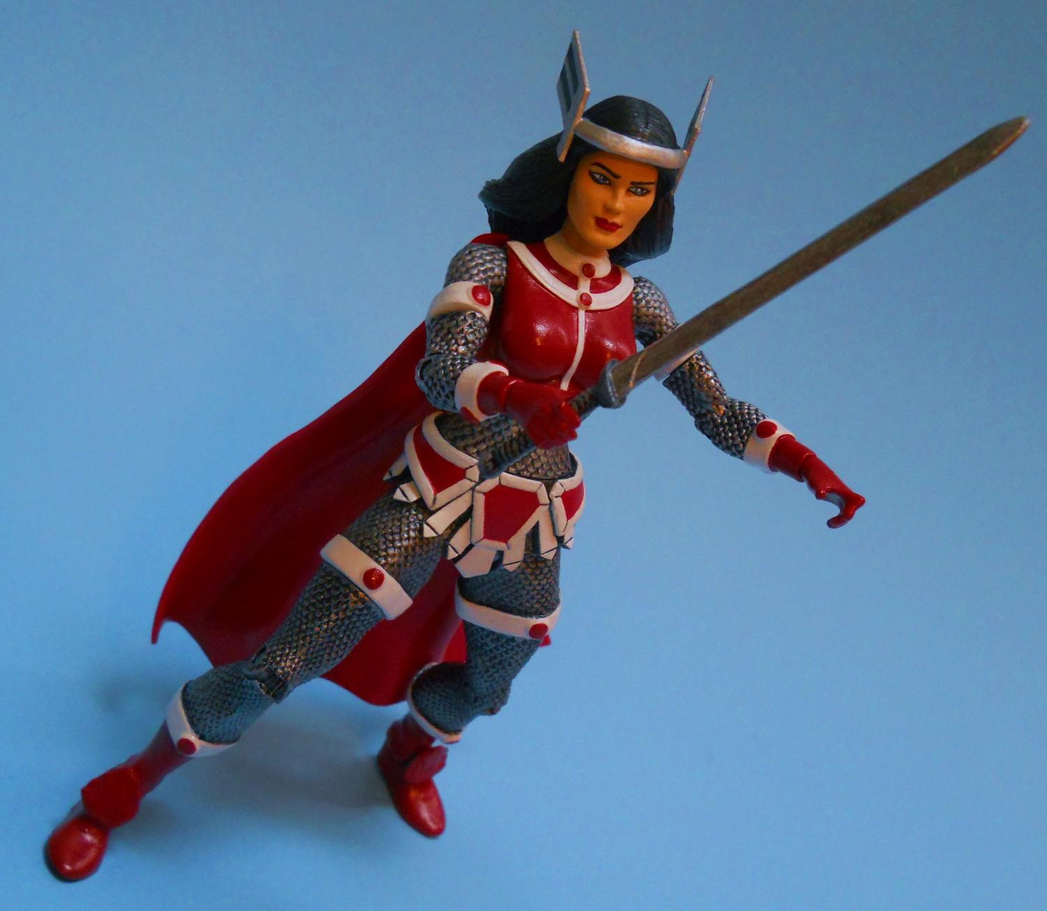 My latest custom is a 6 inch scale Lady Sif to go with my Marvel Legends figures. She began life as a DCUC Big Barda figure. I took her apart and used an Xacto knife to cut out sections of her skirt. I sculpted a headband to cover up her tiara and the wings on her head are cut out pieces of heavy cardstock. I repainted her from head to toe with acrylic paints. The sword originally came with DCUC Bronze Tiger.