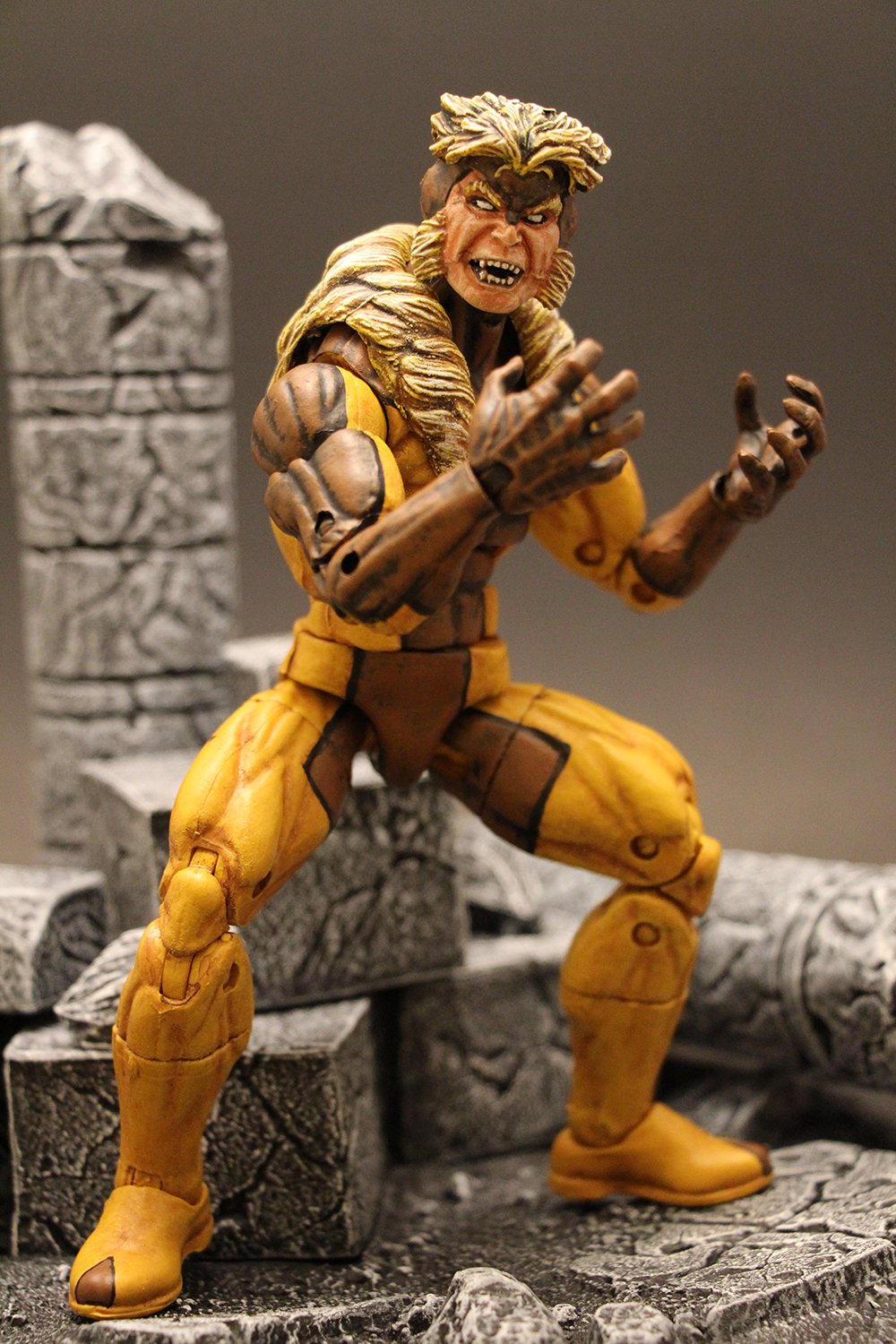 First time posting here, so here it goes. This was a more complex custom than it should have been. After melting one base body with Acetone, I used an Ex Nihilo figure and the head and furr from a Toybiz Sabretooth. Painted all of the parts and a new Sabretooth was born.