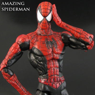 With so few decently articulated Spiderman figures out there here's one done in a 6" 2012 Marvel Legends style. He was made from a McFarlane Spiderman torso with arms, waist, and legs from an older Spider-sense spiderman. His head came from the most recent series and the eyes modded. Powerful magnets are buried in his feet so he can stick to metal surfaces. The range of motion in his joints was extended by removing/adding plastic and he was given a metal wire webline he could stick to as well as a web-cast. Black and red make him stand out, this Spidey is ready to take on anyone!