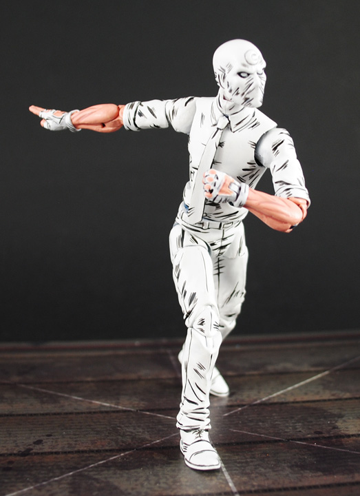 He's pale and mysterious, protector of the streets under the light of a full moon. It's Moon Knight in his Mr Knight suit! This custom Marvel Legends Moon Knight was created using a basic Chameleon suit body, Scarlet Spiderman lower arms, Captain America hand set, and Blizzard head. I went as true to comic form as I could with the paint job that solely consists of a bright white basecoat and hard line shading on everything else. The effect makes him look like he stepped off the comic panel!