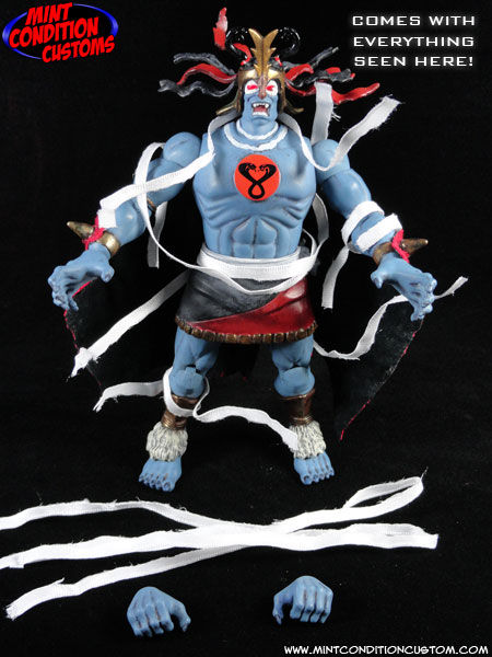 To see more of this custom, visit ---> Custom Mumm-Ra w/ Light Up Eyes 6" Thundercats Classics Action Figure - Created November 25th, 2013 - Mint Condition Customs Ever since I first saw the Thundercats Classics Mumm-Ra action figure, I saw a lot of potential. The big hollow torso meant I could fit some wiring in there, and that was what made me give him light up eyes! I made sure it wouldn’t interfere with the head movement, so the head still retains full articulation and stays lit up the whole time with a flip of a switch on the back. I also took some poseable ribbon and made him some bandages that can be wrapped around the figure any way you like, and even posed to look like they’re shooting out, as if Mumm-Ra is about to grab one of the Thundercats to mummify! And of course I had to give Mumm-Ra his awesome cape. I took some red and black fabric and combined them to be show accurate, and made the cape look tattered and worn. It looks cool, is easily attachable and detachable from the figure, and moves perfectly in conjuction with the arms of the figure. After a full repaint to make him look more realistic, such as making his gold armor look ancient and rusted, Mumm-Ra is ready to summon the ANCIENT SPIRITS OF EVIL to take down those pesky Thundercats! ![]() ![]() ![]() ![]() ![]() ![]() ![]() Thanks for looking! |
