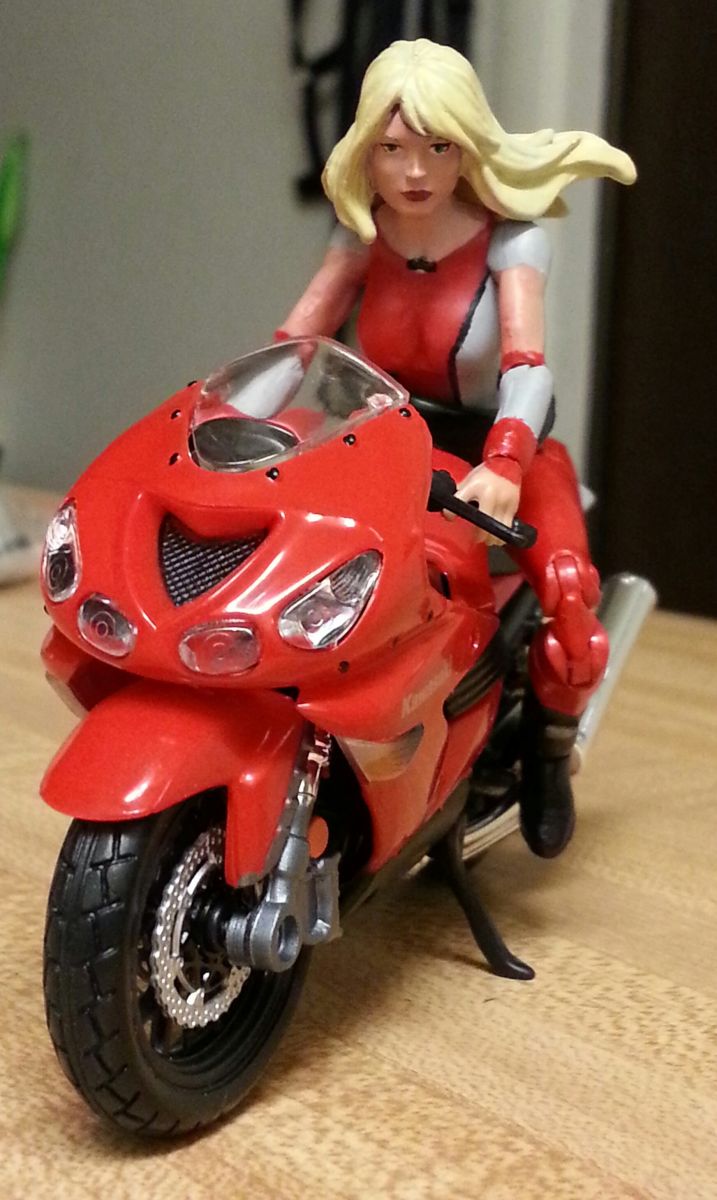 The red cyclone is a CMs Corporation Mospeada Ride Armor bike. The line is 1/18 scale, so it's perfect for MU customs. It's transformable and comes with an articulated Rook in her battle armor. Kind of a crappy, fiddley toy, but the bike looks great.