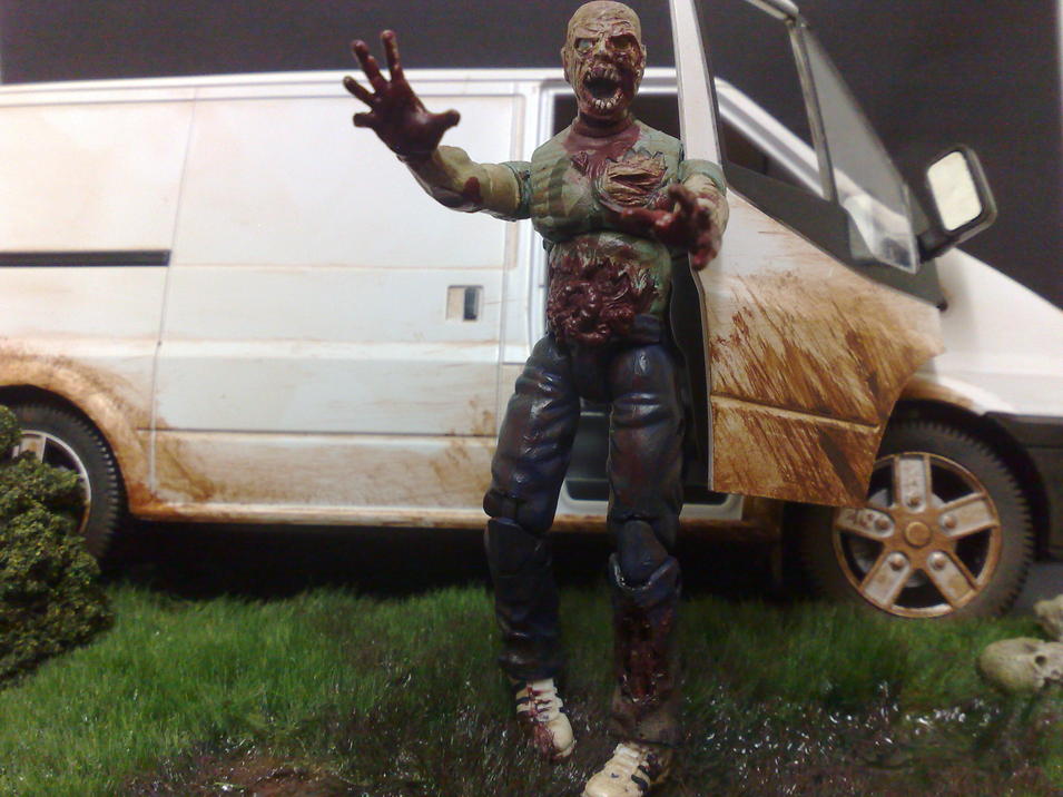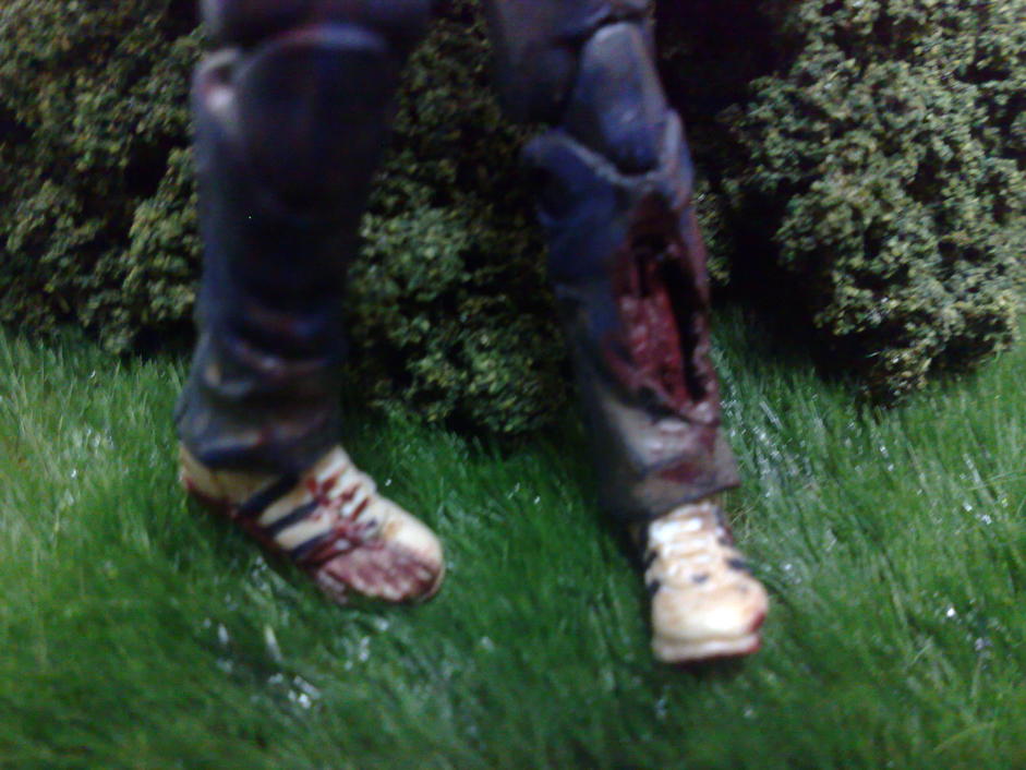 this is a walking dead zombie fig and small ( incomplete ) diorama i was working on. the head is slayer designs and torso asphalt's. really really enjoyed making this as it tested my painting skills a bit more and who doesn't like painting gore? used a army of darkness skeleton for the right foot and left shin. hope you like and as always criticism welcome