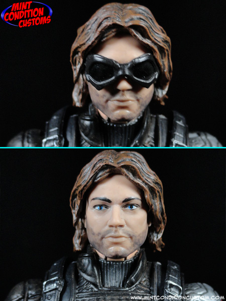 I dig the movie Winter Soldier figure from Hasbro, but felt it could have been improved upon. So I took the masked head that came with the figure and sliced the mask and goggles off, dremeled out the back a lot, cut the goggles off and separated them from the mask, and now you can slip them on and off the unmasked head very easily. They tuck in under his hair, so it holds great. I also removed the eye paint on the unmasked head, added some stubble to the face, and a black wash to his hair. So now there’s four different looks the figure can have. I repainted his torso area black, and then dry brushed a bit of leather over it, which is much more movie accurate than it was before. I also did a general weathering job over the whole figure to make it look more realistic. I attached a knife from a NECA Dutch figure that can be removed easily on the back of the belt. The finishing touch was equiping him with weapons he used in the movie. I gave him a rifle similar to one he used in the film, and also cobbled together a gun that looked like the one in the movie that launched that “magnetic disc bomb” in his initial scene. Now Winter Soldier is ready to take down Cap!