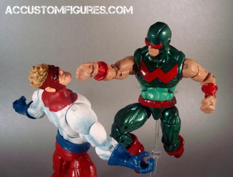Wonder Man was made from a Hyperion base, Beast head, Wonder Man cuffs, and Guile fists. Everything else is sculpted detail. Wrapped him up in a combo metallic matte ionic paint job. Enjoy!
