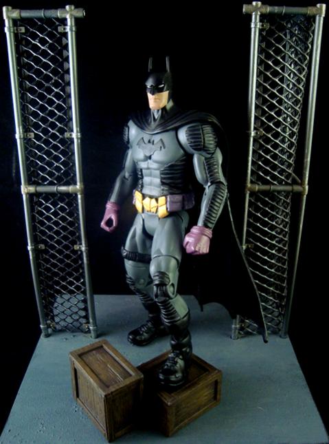 Here we see his purple gloves, gray purple belt with gold Bat buckle and pouches. The belt buckle, glove cuffs, boots, leg belt, and armor was sculpted onto an Obsidian base (just a standard DCUC buck). I added movie cap lower boots so he has the new ML ankle articulation. I got his grappling gun pretty perfect from what we saw in issue #24, and I found the YJ Batman head to be pretty accurate with the high ears, and cowl near the jaw.