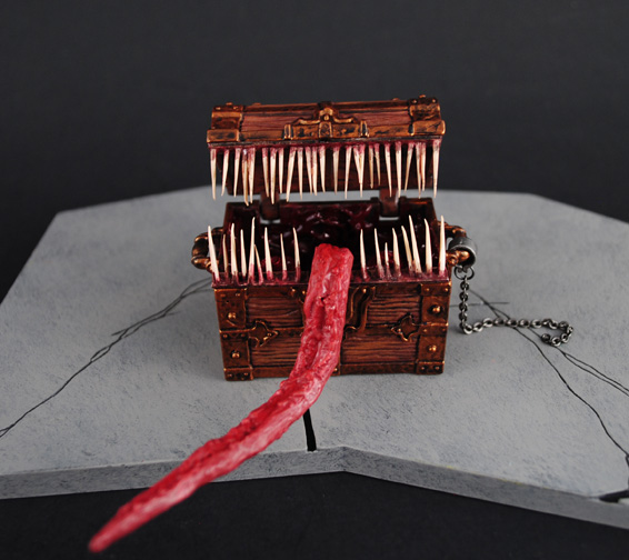 Better check the chain because one false move and you're a meal! In the Dark Souls video game the Mimic chest was a vicious opponent, devouring anyone foolish enough to loot it. Here I've created one that's ready to take a bite out of your fellow knight! The Mimic chest was created using a basic Chap-Mei treasure chest found in those pirate toy sets, body/arms from a NECA Prometheus Decon figure, toybiz Icons Venom tongue, sculpted detail and metal chain. The inside of the chest is sculpted with plug-in joints that you can remove the arms and tongue from. Next pop off the body, remove the teeth rows, and the figure breaks down into an unassuming treasure chest! Finally the custom was hand painted with metallics and wood finishes, airbrushed and sealed. It fits in with 5-7" figure series like Assassin's Creed, ML, and Mythic Legions.