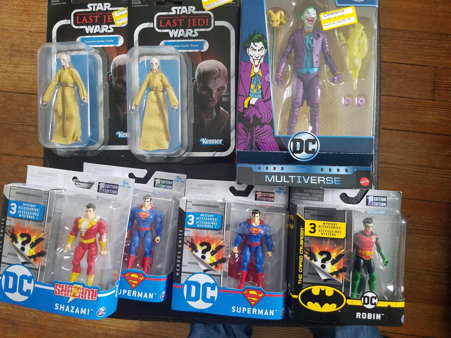 Went to Walmart and they had nothing Target had them out but by the time I got there they were almost gone so I took what they had left 2 Supermans, Robin and Shazam. Also scored some nice figures on clearance.