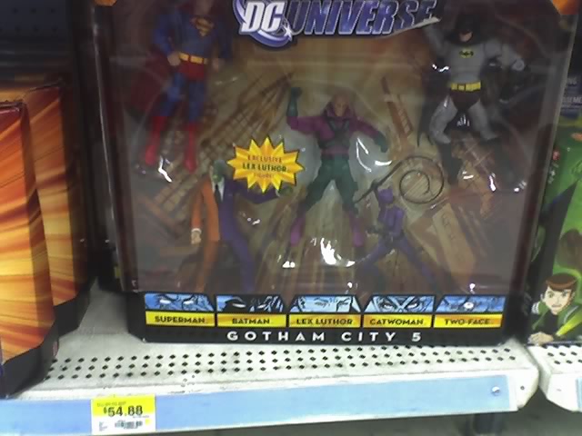 I have found these by accident in a Walmart in Miami. The set includes Superman, Batman (black/grey), Two face, Lex Luthor (super friends ver), and Cat Woman. She is dressed in her latest reincarnation (Jim Lee) but her colors are purple and black (Jim Balent).