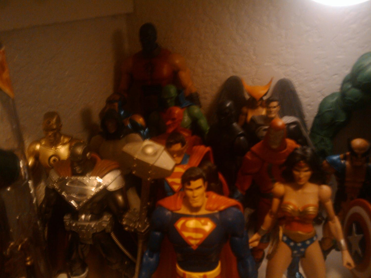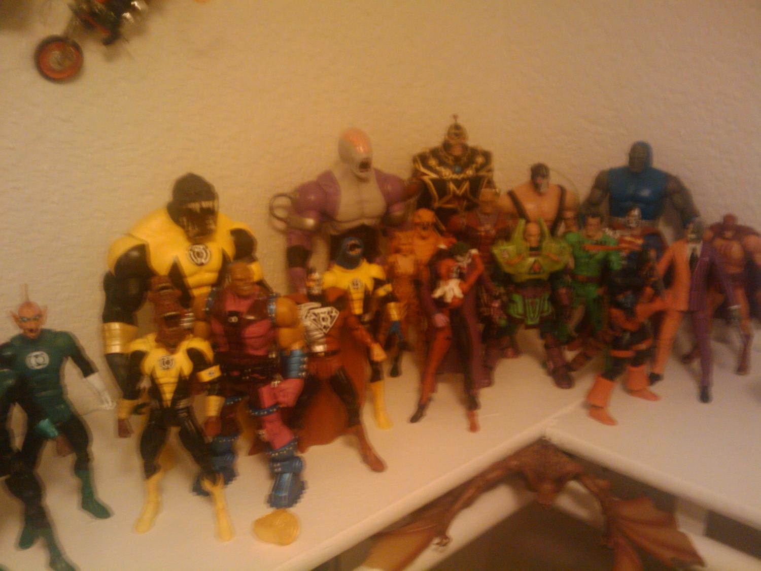 I have four shelves dedicated to DCD. Two of them are eazy to explain... I really need to catalogue the other two. Shelf 1: EVERY individual Mattel Green Lantern Corps toy. This includes *one* DCUC Hal Jordan (Wave 3), John Stewart, Katma Toi, Tomar Re, Mephyl, Naut Ki Loi, Guy Gardner, Kyle Rayner, Abin Sur, Sinestro (GL), Sadom Yat, Alan Scott, B'gd, Stel, and Kilowog. Plus- Salaak (DCD), and a custom GL TF (From the Sideswipe mold). Added to this are the GL Movie Masters- G'hu, Sinestro, Maskless Hal, Isamot, Rot Lop Fan, Galus Zed, Naut Ki Loi, Krona, Bzzd, and Kilowog (Only missing Abin Sur and Greenman) Shelf Two is where I keep all the other corps (All Mattel unless stated otherwise): Star Sapphire- Carol Ferris, plus Wonder Woman (DCD) Blue Lanterns- Flash, plus Saint Walker and Brother Warth (Both DCD) Indigo Tribe- Atom, plus Indigo 1 (DCD) Red Lanterns- Skallox, Nitelik, and Dexstar Orange Lanterns- Lex Luthor Black Lanterns- Black Hand, Abin Sur, Hal Jordan, Nekron White Lanterns- Hal Jordan, Flash Sinestro Corps- Sinestro (wave 20), Scarecrow, Batman, the little virus guy, Karu-Sil, Romat Ru, Low, Maash, Cyborg Superman, Arkillo, plus Mongul (DCD Blackest Night), and Kryb. And two Manhunter robots. The other two shelves, one is stuffed with heros... mostly Justice League and Titans. The other has all the villains I have, and the overflow heros, like the Metal Men.