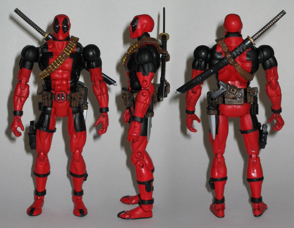 My oldest nephew was wanting a red Deadpool, and since it looked like the wave 3 variants are not coming anytime soon I thought I would make one for him. He is of course a standard repaint of the X-Force Deadpool, but with a little difference. I made a new bandoleer/chest/bullet strap for him using a DCUC Jonah Hex bandoleer. I then made a sword sheath using styrene and rubber bands. The sword was from my fodder bin I think it was part of a ML base. Deadpool V2 ![]() ![]() ![]() ![]() This Deadpool is actually a re-vamp/rebuild of the old one that I made for my youngest nephew last July. Now that my skill level has improved since then I wanted to re-do this one for him. Deadpool started out as a Wal-Mart reissue Silver Surfer with a ML Series 6 Deadpool head cast from Casting Cave. I also swapped out the forearms/hands from a Mr. Fantastic from fodder box. The belt is from a LCBH Super Patriot. I used Jonah Hex's bandoleer, Hit Monkey's pistols, ROML Deadpool sword, holsters from some cheap figures from Big Lots, and I used styrene strips for the straps. Then I finished him off with a full paint job. Deadpool V1.2 ![]() ![]()
